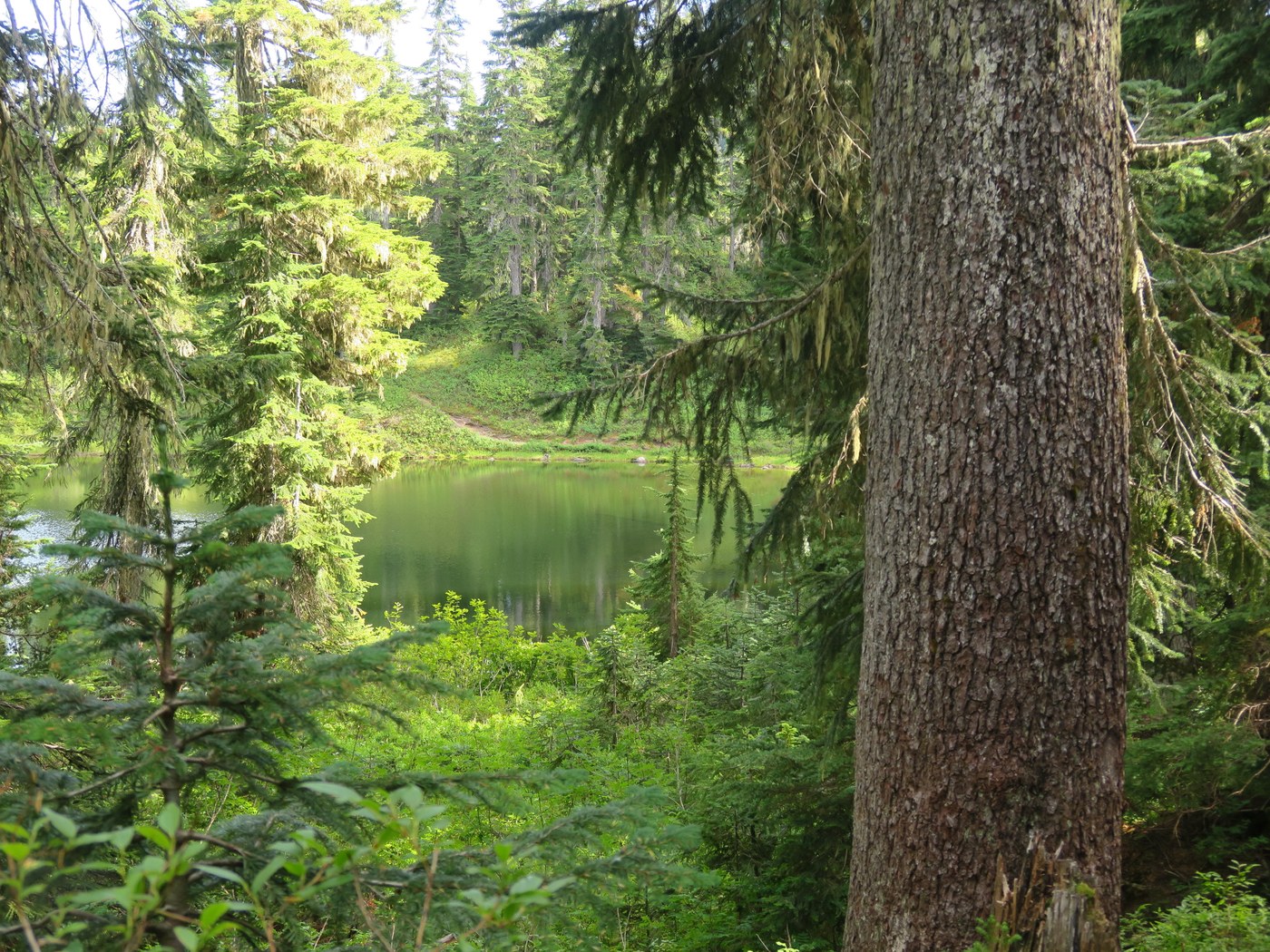 I needed a mellow hike for my last hikeathon hurrah. My legs and body were too tired for any bada**ery, I just wanted to pick berries. We came in from Tunnel Creek. The road going in is pretty good for a forest road, there are, of course a few potholes, after all it IS a forest road. There was a Camery at the TH, so any car can get there. Also, there are a number of side roads, but stay on the main one. When you come to a main intersection, go left, you should see the TH kiosk right away. The trail is in pretty good shape, but there are still some boulders, rocks and root ladders you notice more going down. Hope is the first lake, a small lake with a couple of places to camp. There is a loo just as you get to the intersection with the PCT. Mig is another mile farther and a bigger lake. There seemed to be more camp spots here and a loo. We had lunch here, my hiking buddy snoozed while I filled my Nalgene with blue goodness. There were a rush of hikers coming thru on their way to Snoqualamie and a couple of NB hikers heading for Canada, only 2 other day hikers besides us. Once they passed, we had the lake to ourselves. Great cloudy day hike of 5 miles RT. When you come out, you cannot make a LH turn. Turn R on #2, then stay in the LH lane, there is a nice pullout WB that you can turn into to reenter the hwy once you make the L turn across traffic