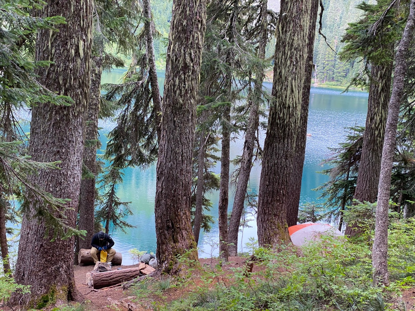 We left from the eastside later to let the weekend campers clear out, but it was a little too late so we had to set up camp in the dark. There are basically no bad campsites at the lake, but some have easier access to water than others. The Mirror Lake trail joins the PCT at the northeastern corner of the lake and continues south along the east side of the lake. There are three or so sites along the north shore of the lake, two of them look big enough for several tents. There are about five sites along the eastern shore, all set slightly above the lake on a bit of a slope. All have a short path down to the water, and several of those paths have space to sit by the water (one we looked at had too many small twiggy trees at the water for space to lounge but you could still fill your filter bag). There is also an backcountry toilet across the PCT on this side and up the hill a bit that someone has kindly marked with flagging tape. There are about five sites along the southern shore of the lake, and at least three of them are big enough for lots of tents and have great, direct access to the water (though the first one on the southeast corner looks like the muddiest of the bunch).