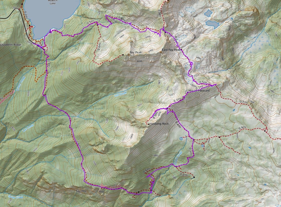 I did a clockwise loop starting from Mowich Lake, following the unmaintained Knapsack Pass Trail up to Mount Pleasant, then across the ridge towards Hessong Rock, and finally descending to Spray Park and following the Spray Park trail back to Mowich Lake. This added up to 7 miles and 2960 vertical feet of gain.