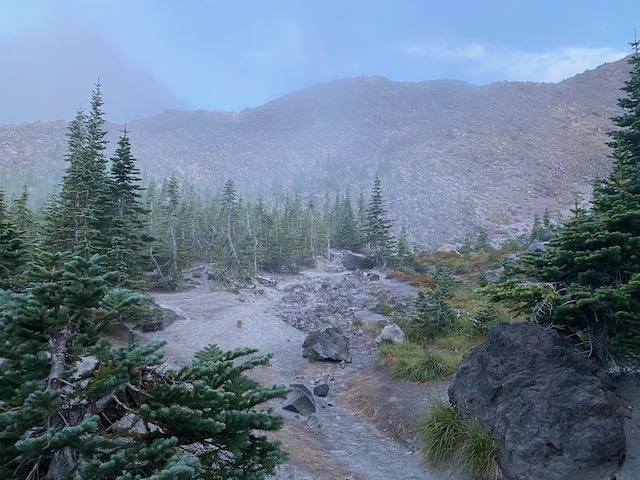 Following the suggestions on a previous WTA trip report, we opted for an early start to try to avoid the mid-day heat and catch the sunrise over Mt. Adams. Print or otherwise save your map to the trailhead because you can't rely on cell service to work outside of Cougar, although you may get stray coverage bursts on the mountain. The thick fog on the drive from Cougar to Climber's Bivouac was treacherous at times, with a rutted dirt road on the last stretch and visibility as low as < 20 feet. Be sure to write your information in the logbook at the trailhead. We were on the trail by 5:30 wearing headlamps and the forest hike felt like a breezy stroll. As the sunlight crept in, we got our first glimpses near the Loowit Trail of the bouldered ridges awaiting us.