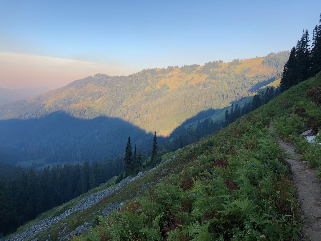 Started the morning with some nice, rolling terrain before what would be the hardest day of our planned route. The messiest bit of trail on the whole trip was likely the Kennedy Creek section which was muddy, overgrown and re-routed, only to descend to another broken footbridge. Just like Baekos, I'm not sure this is a "creek." After climbing back out, we reached a junction with the Kennedy Ridge Trail which led to the former Kennedy Hot Springs. If we'd had more time, it would've been great to branch off and see what remained. We pressed on, climbing up Fire Creek Pass, stopping to fill water along the way. The climb up this pass was likely the most pleasant and we were greeted with a beautiful view of Glacier Peak, a nice bit of wind, but also a perfect view of the terrible exposed switchbacks that would meet us on the next climb. We took a quick break at Mica Lake and got a view of the Downey Creek Fire that was burning at the time. After steeply descending 4 miles, we crossed Milk Creek, filled our bottles and started up the next climb. The climb from Milk Creek has to be one of the hardest because you are climbing switchback after switchback, most of which are exposed and require bushwhacking through ferns. The summit doesn't offer much, but there are a few places to fill up your bottles and camp, which we gladly did.