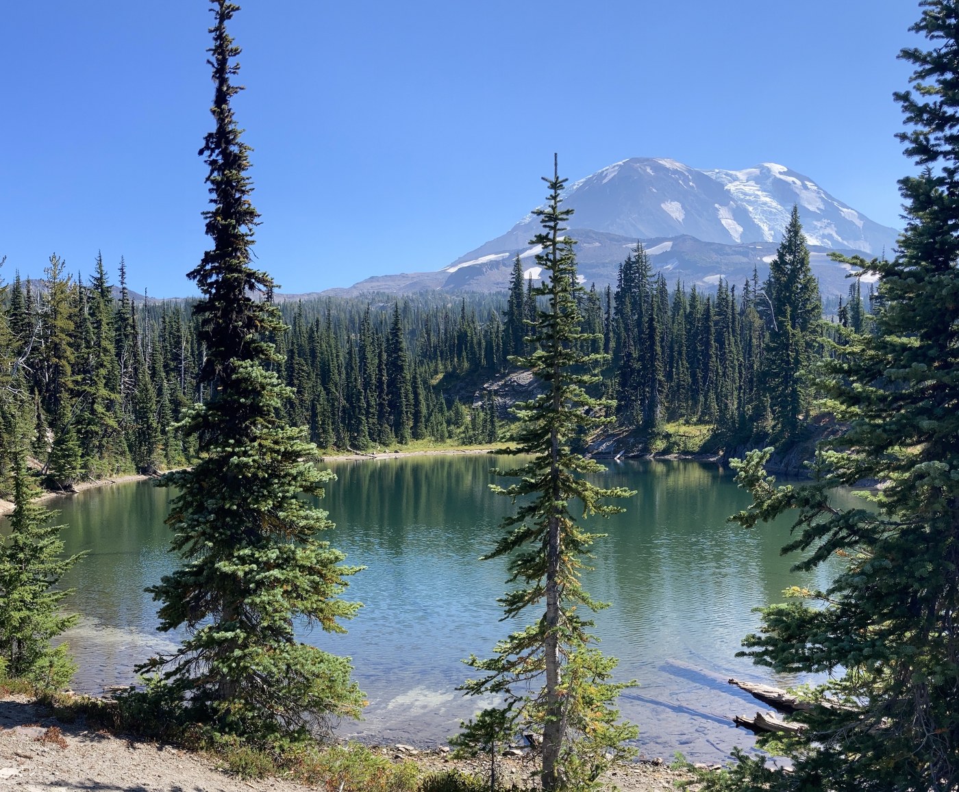 Streams were not a problem at all: one could hop over the rocks without getting even the shoes wet. The persistent winds were a problem though: picking up sand and blowing you off the ridges. We struggled through those, but enjoyed clear views of Mt. Adams and Rainier. It was a beautiful day after all. Camped at the lower campground to avoid the howling winds, which was a good choice. The winds subsided in teh next couple days and we started to see Foggy Flats fill with campers: check your wind report before you go!