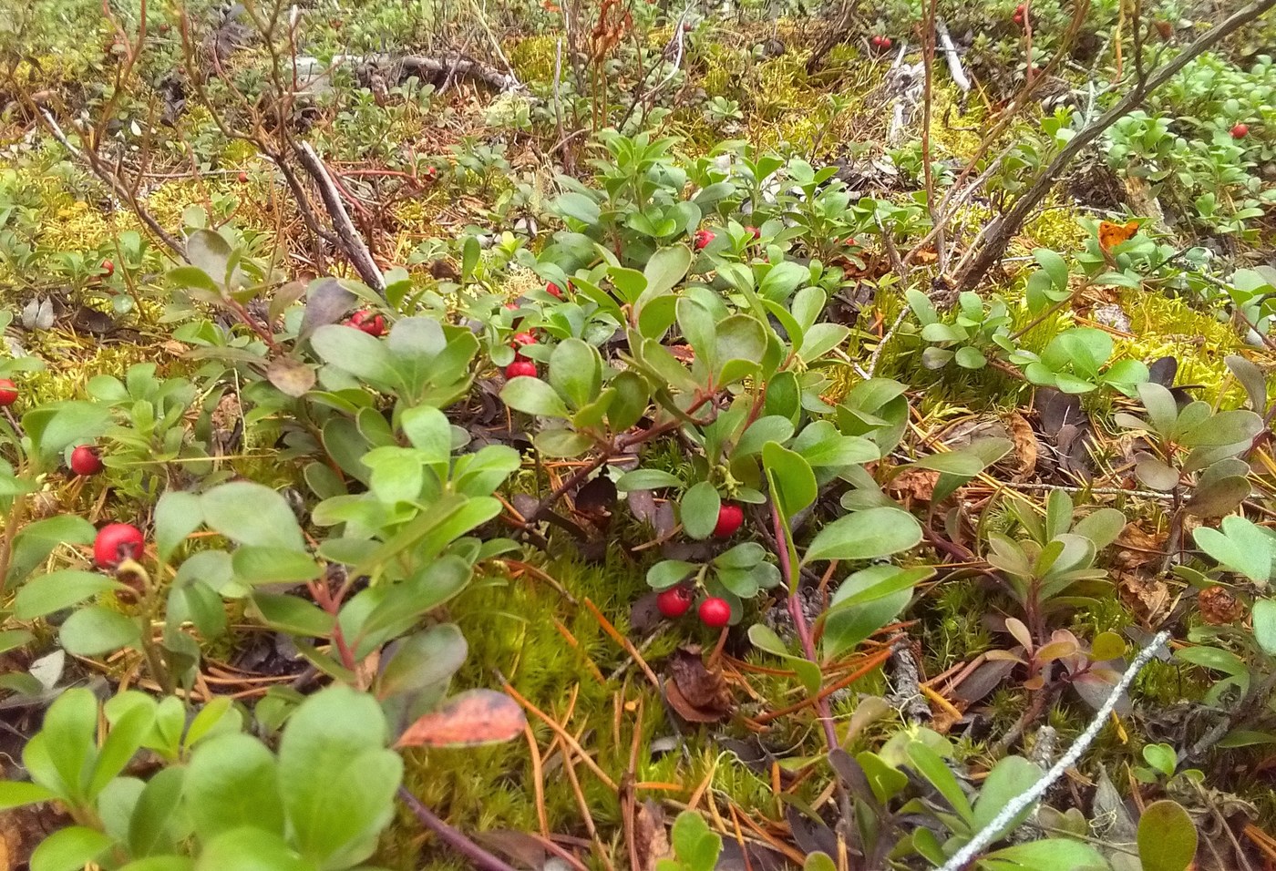 Included in the pictures: salal with its trademark blue berries, kinnikinck with round red berries, and a grayish lichen found in the moss. This lichen (a fungi-algae compound organism) is showing off its red tips, which are spore-bearing fruiting bodies. Not at all sure what type it is.