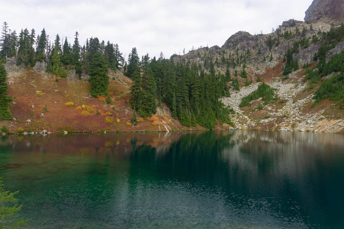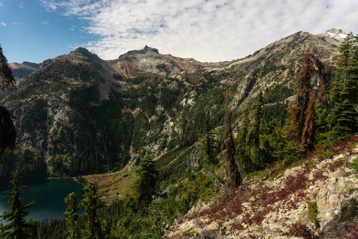 After Squaw Lake, the trail climbs gradually to the pass. The pass was covered in red from the blueberry leaves, but the berries were peak ripeness. It was hard to keep pace when I just wanted to stop and snack. I stopped at the pass junction with the PCT for a break and decided to continue on the PCT to the Peggy's Pond junction.