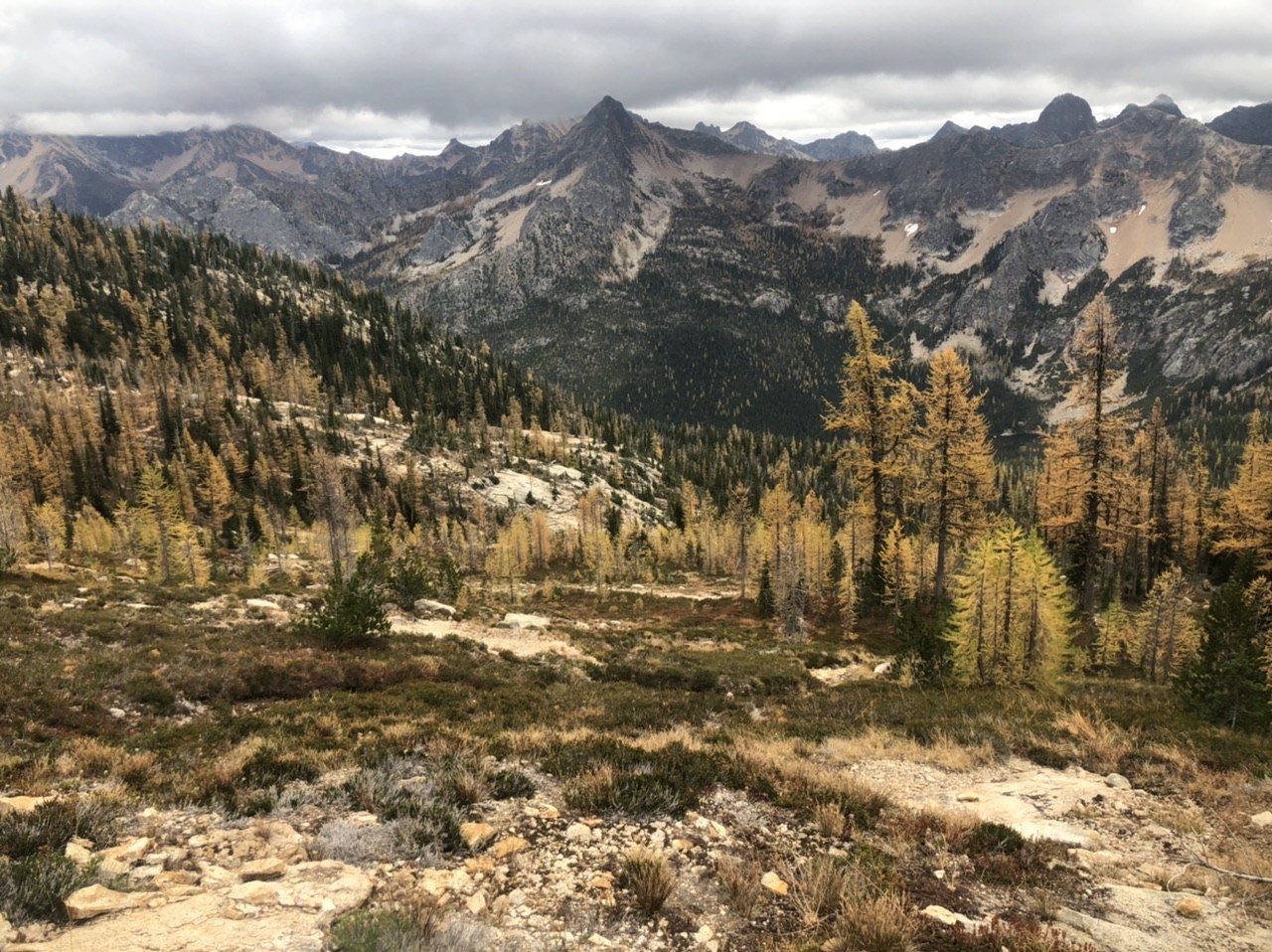 Such a lovely, well maintained trail. Larches bright and lovely everywhere, if starting today drop a couple needles. This would be a great launch pad for a quick overnighter, seemed much less crowded than some of the other larch march trails.