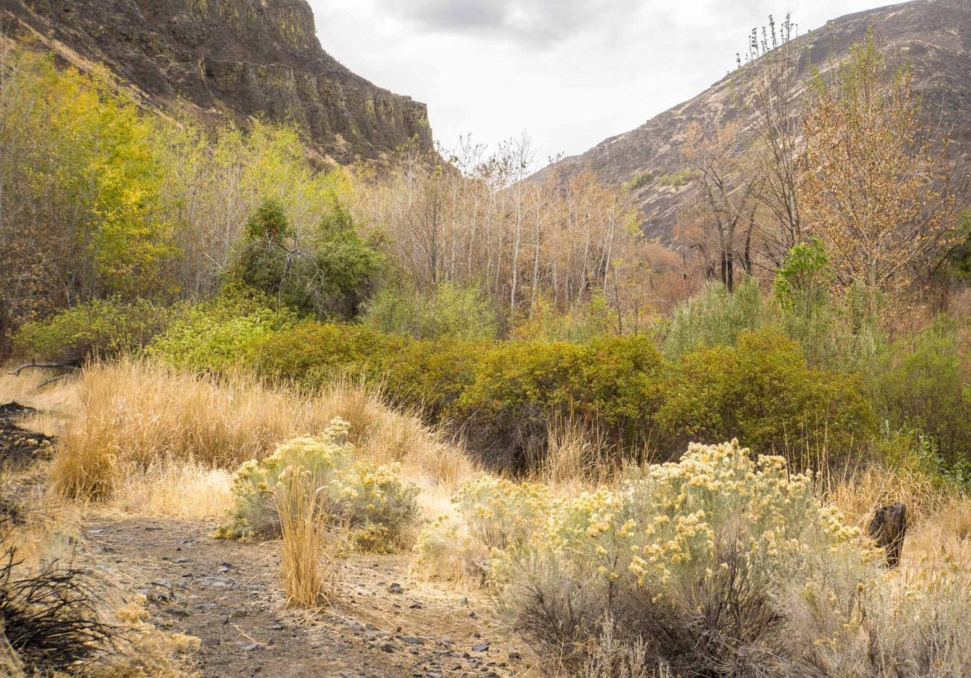 I stopped at Umtanum Canyon on my way home from my hike up Rattlesnake Dance Ridge to see if the bridge across the river was open yet. It was, and so I hiked up the canyon about 1/2 mile just to see what it looked like. Most of the shrubs were burned, but many of the trees appear to have survived. Many of these had brown leaves, but the trunks did not appear to be burned much. I suspect that the heat from the fire dried the leaves out. And already the grasses & some of the shrubs are starting to regenerate. Also of note were signs stating that the Umtanum Recreation Area (parking area & bridge) will be closed from 10/26/20 to 5/14/21 so that the area can be upgraded. No public access will be allowed. It looks like they are going to basically rebuild the bridge and pave the access road and parking area.