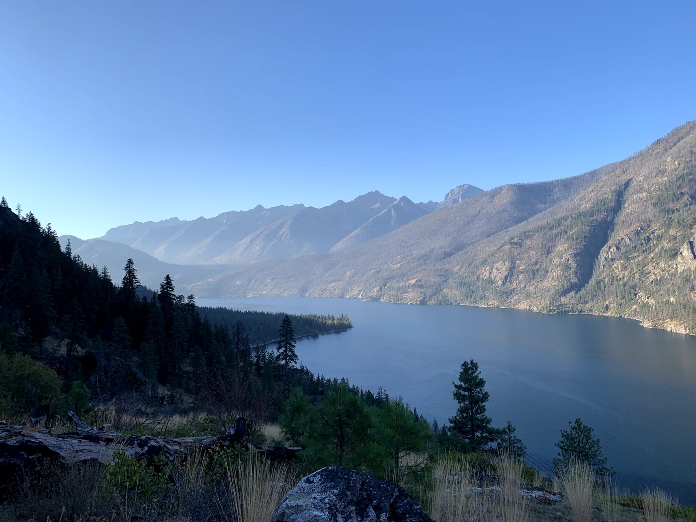 Great end of season hike on the Chelan Lakeshore Trail. Lady of the Lake ferry dropped us off at Prince Creek at approximately 10:30am on Saturday morning. We were the only two people dropped off at Prince Creek, though the ferry was full and sold out. We hiked 11 miles in some lightly hazy weather to camp at Moore Point. The trail was pretty easy, though the brush is fairly overgrown onto the trail at points. We encountered one baby rattlesnake that stared us down for about 10 minutes before going on it's merry way. This is a very exposed trail, and we got quite warm, even though it was only about 70 degrees. There's not a lot of shade and it's very dusty and dry!