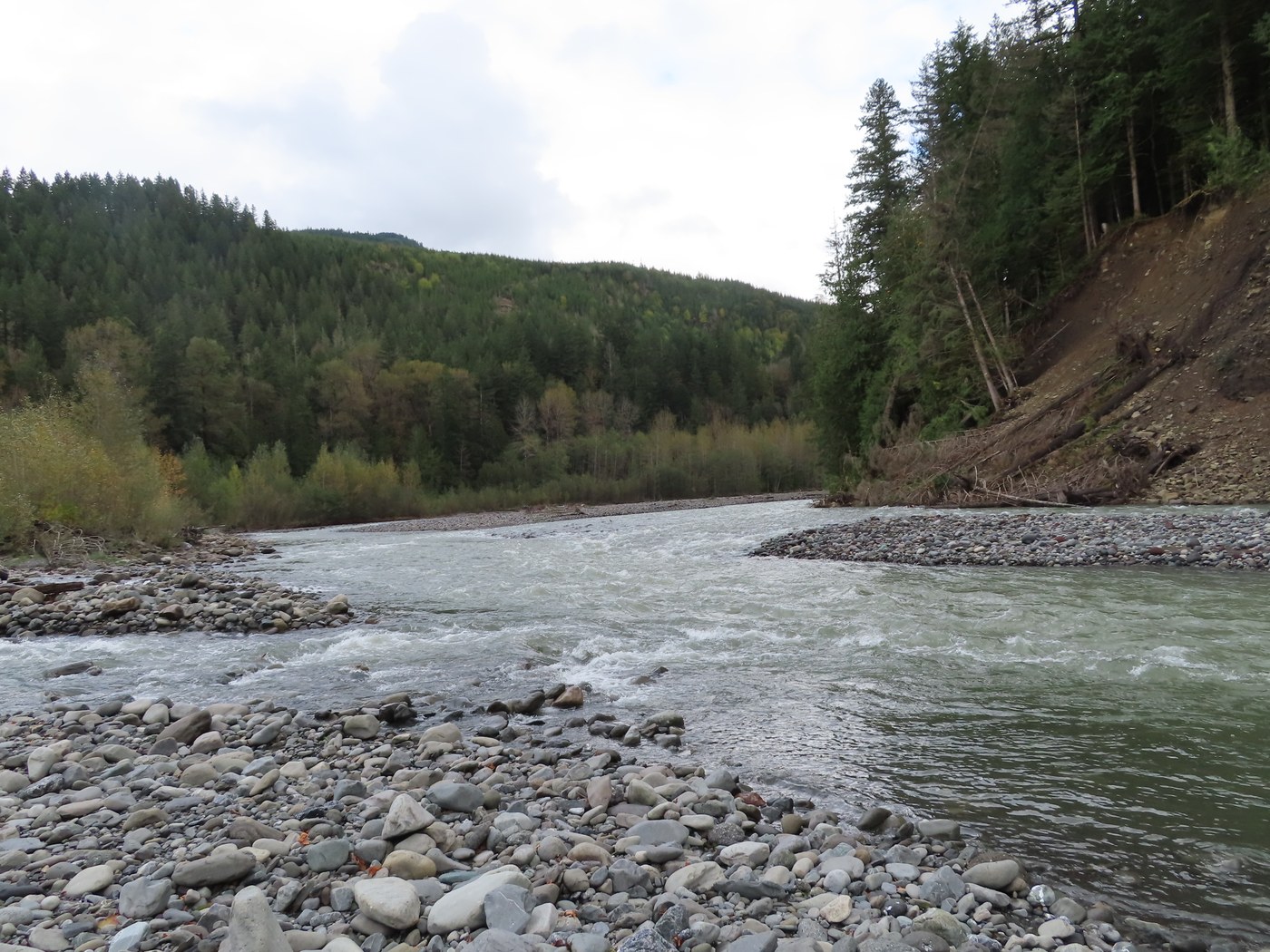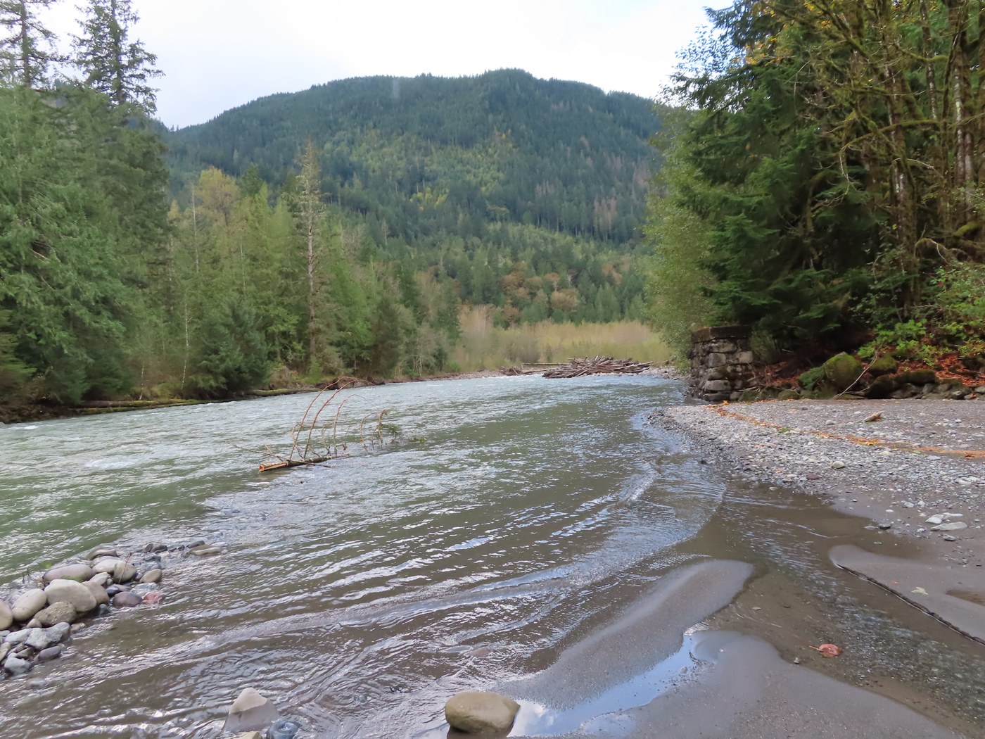 We were staying in a cabin up near the town of Glacier off the Mt. Baker Highway 542 and found this trail at Glacier Springs last week. The trailhead is in back of the development with a nice view of Mt. Baker. This trail is not in guide books or on hiking maps. At the start is a kiosk with a map, photos and info by the Whatcom Land Trust Salmon Conservation and Restoration Site with the Whatcom County Flood Control Zone District. Due to Canyon Creek flooding, the old levee was removed and a rock revetment built in 1994 along with twenty three log jams built to roughen the stream banks and form deep pools to shelter salmon. 13,300 trees were also planted to shade the stream. The trail begins on an old road before turning into a hiking trail. We checked out two side trails down to the creek with some nice views of the creek rapids. There are other trails going through the forest on the way to the N.F. Nooksack River. When we got to the river by where the creek enters it, we hiked down the river bed towards the Highway 542 bridge which goes over it. Found a good log to sit on to enjoy the water and view. A little past the highway bridge is an old stone bridge pier from the days when a railroad went up to Glacier. This hike is 2 miles round trip.