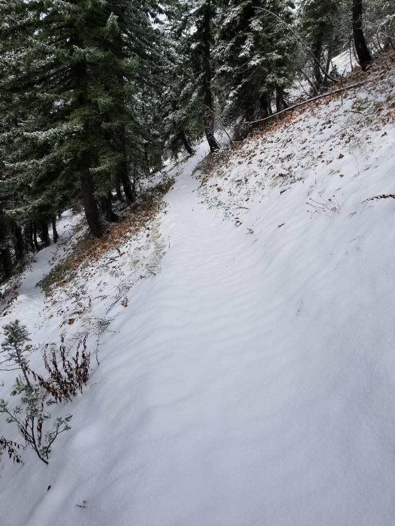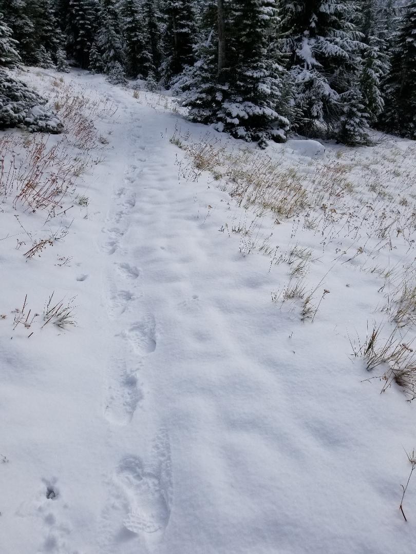 Broke trail, if you could call it that, through 3" of fresh wet snow (4" at higher elevation, 5700"). The trail was still recognizable with a few exception.