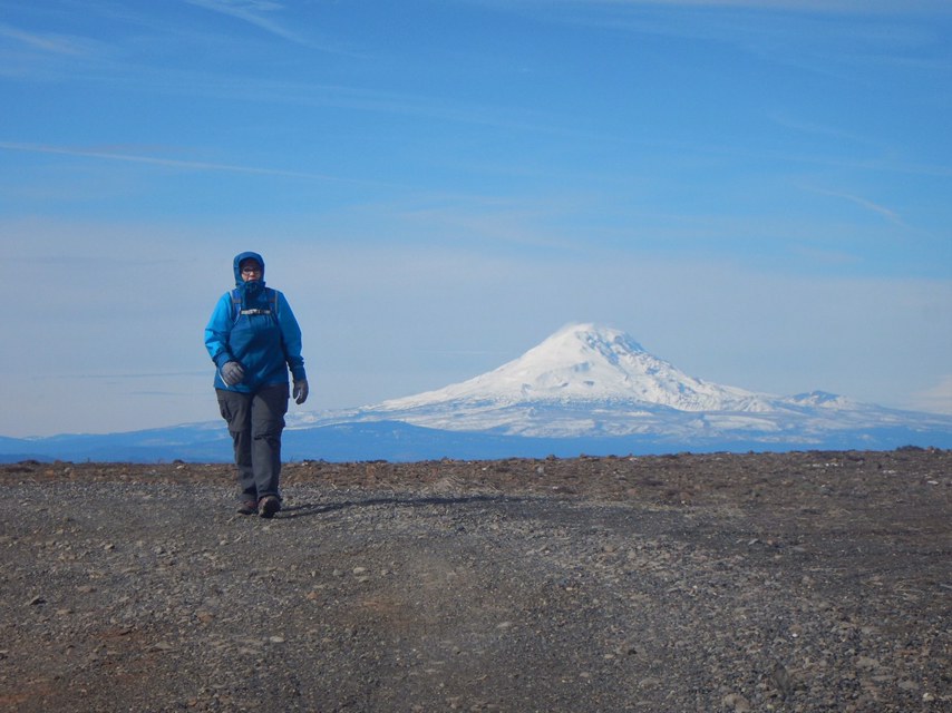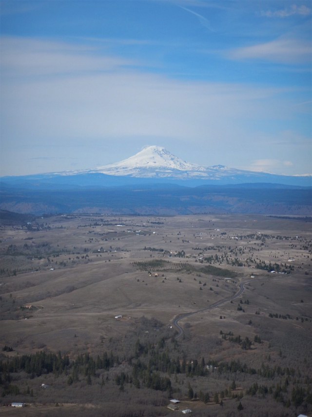 That said, the walk itself was very nice. Mostly it’s a continuation of the wide gravel road, never very steep. It might be a little early in the season: the hills are just dead brown grass. But there’s a stunning view of Mt. Hood the whole way, eventually a nice sweeping shot of the valley around you, and at last the incredible sight of Mount Adams at the “summit”. Turn your head left, Hood; turn it to the right, Adams. And in the distance, a glimpse of St. Helens as well.