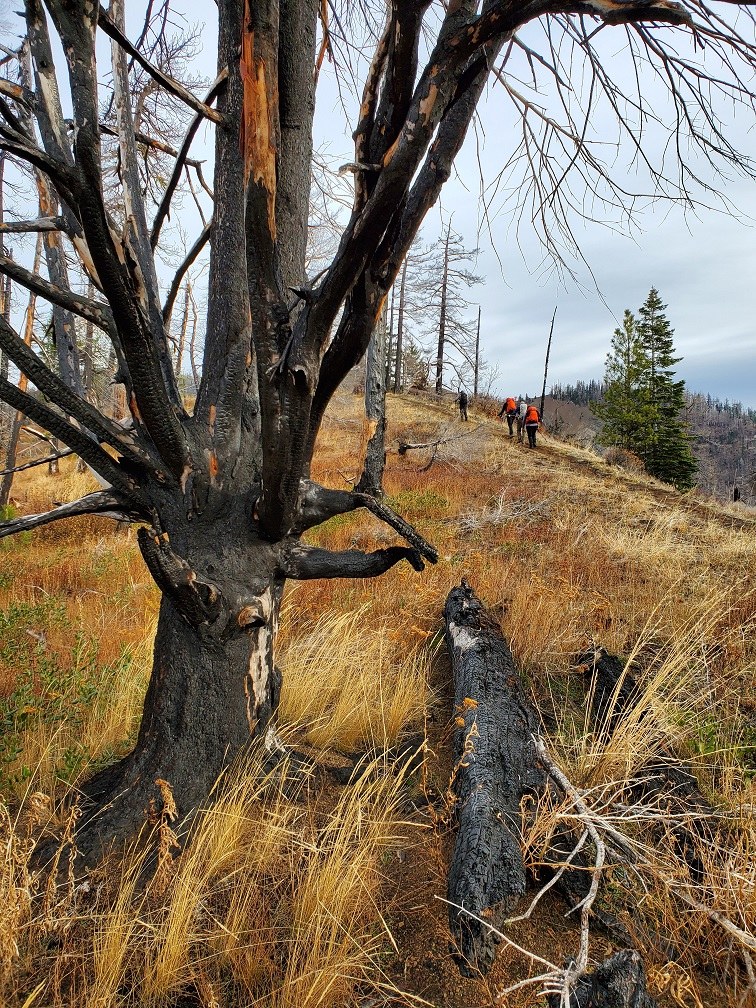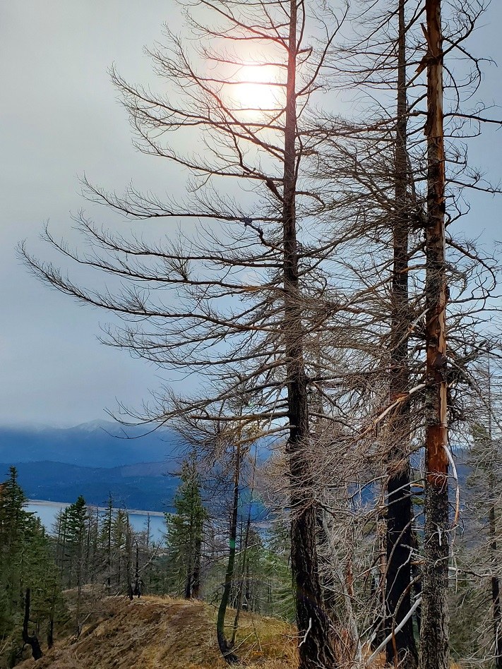 This report includes a 360º video & photo file. Monday morning, great way to start the week. Our group encountered no one else all day. The GPS lead us up the right forest service road toward the actual TH. At ~3500' elevation leave the road and start up the ridge, then cross two more roads while traveling through the burnt forest. The actual TH with its TH sign is beyond these. After the TH sign, there are several down trees across the trail with boot paths to detour around. The trail approaches from the west and we zigzagged our way up the south side of the summit, but the gravel is loose. Belatedly, it was realized there's a better approach by going all the way around to the east side of the summit.