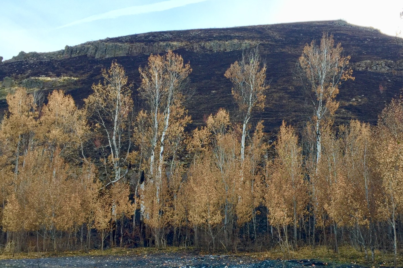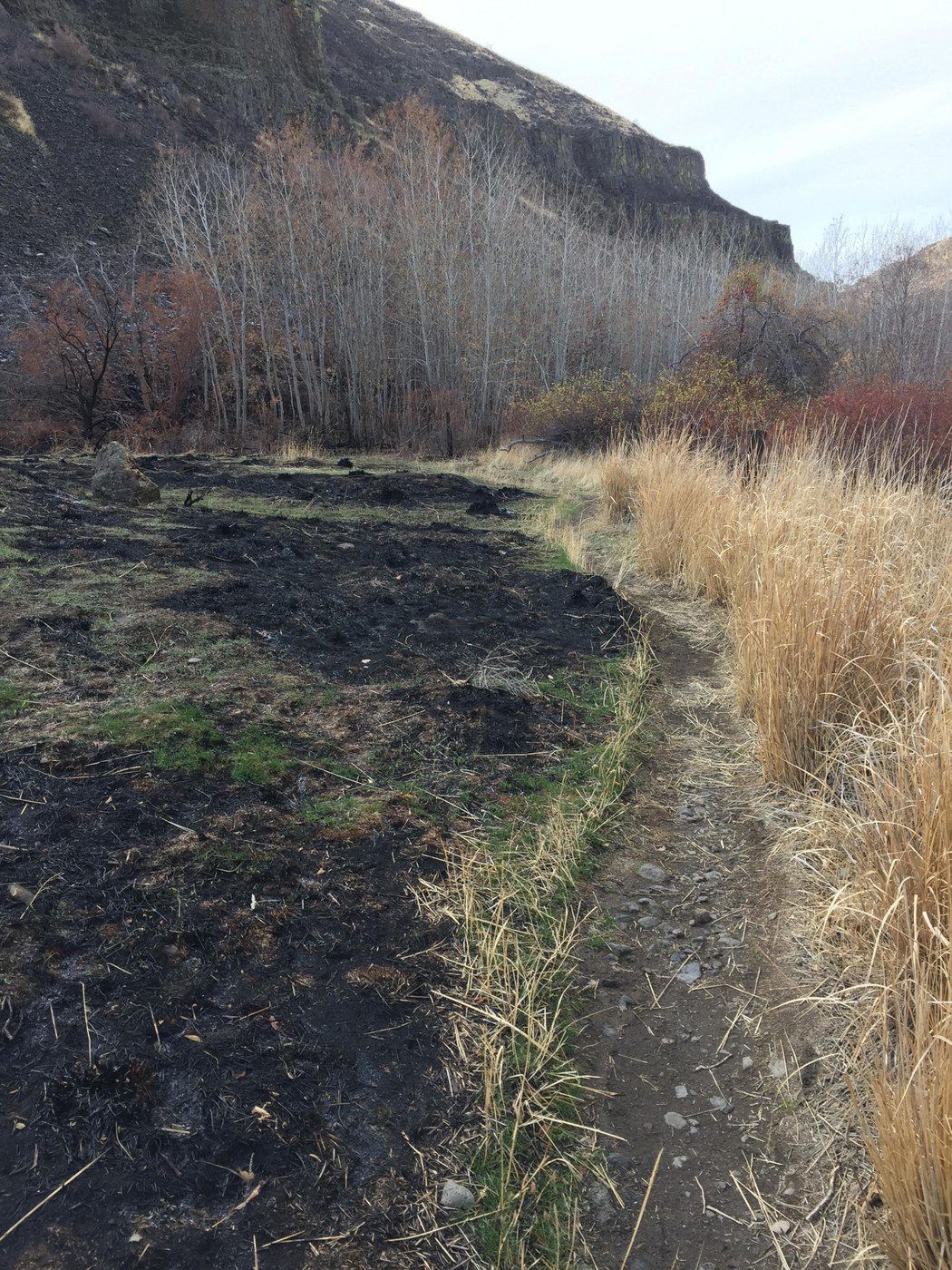 This hike is through terrain that was burned in last Summer's fires, so at some points you are walking on burned ground, and can brush against burned branches, leaving charcoal marks on clothes. So you need to wash your boots and clothes well after this hike! The trail is mostly level, and we only went about 2 miles as it petered out in shrubbery. It's possible to go further but we had a leashed dog which made it difficult so chose to turn around. We saw only three other people the entire hike. Much of the trail is in shade but part of the trail cuts across scree on the north side, fully in sun on our clear day. Some of the trail is hard to find with the burn, so we were forced to make our own way through burned areas at times. It was very cold starting out, low 30s, and gradually warmed a bit in the later afternoon. Gloves and hats needed! We arrived at the well-marked gravel trail head about 11:30 and started hiking around 12, then returned at 2:30, so a relatively short hike. The scenery is spectacular due to the contrast of live plants with the burned soil and trees/shrubs. Part of the south wall of the canyon is fully burned, making the many criss-crossing animal trails much more visible than usual. We have been to this trail previously several times and this was one of the more interesting hikes due to the fire impacts.