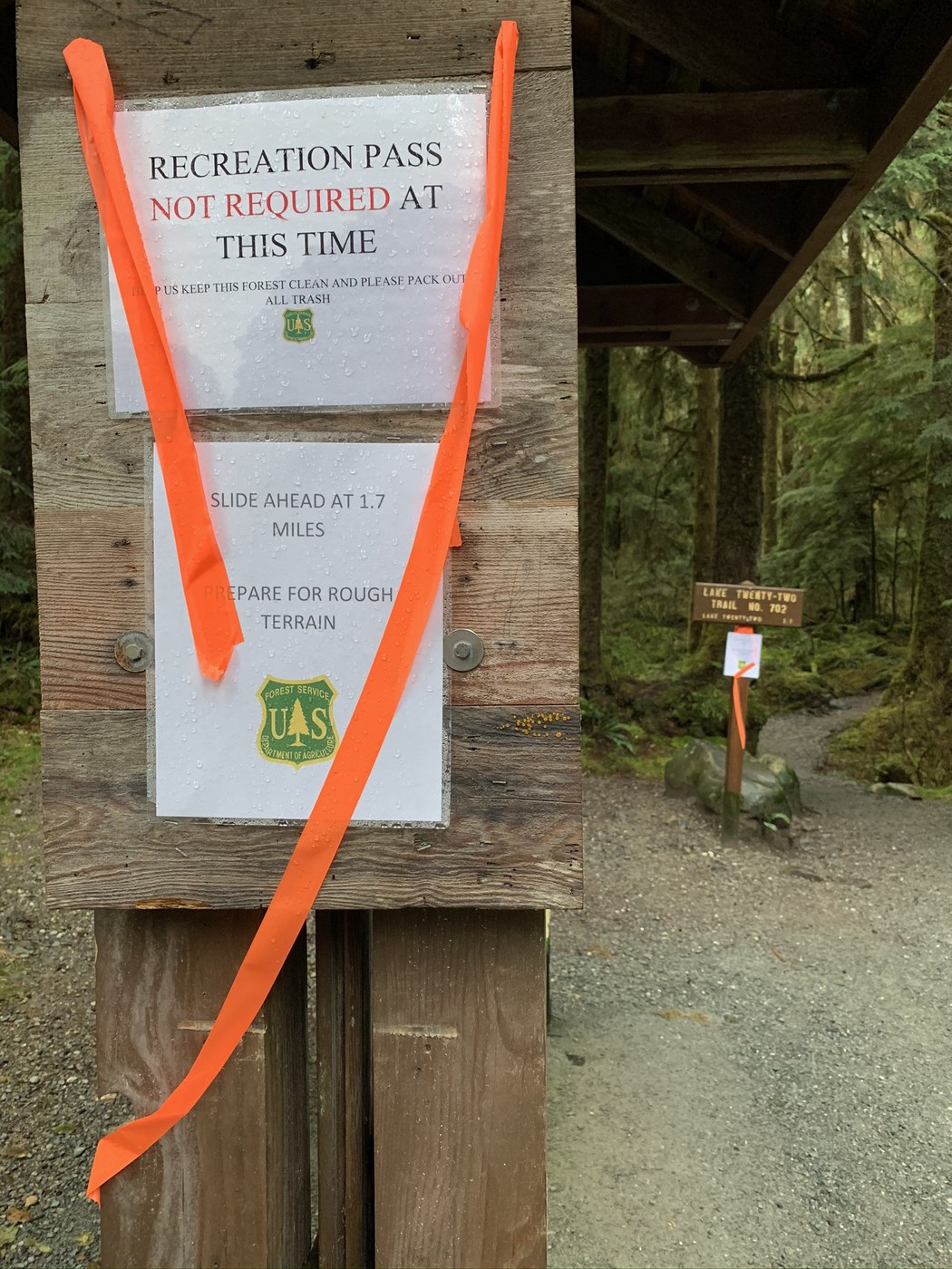 Forest Pass still not needed. The slide is easily navigated, though quite muddy. Snow starts about 10 minutes from the lake. I used spikes, which were helpful but not necessary. There is always water on this trail, and it was running pretty good today. Would recommend water proof shoes. Only 1 trailhead bathroom open. Happy trails.
