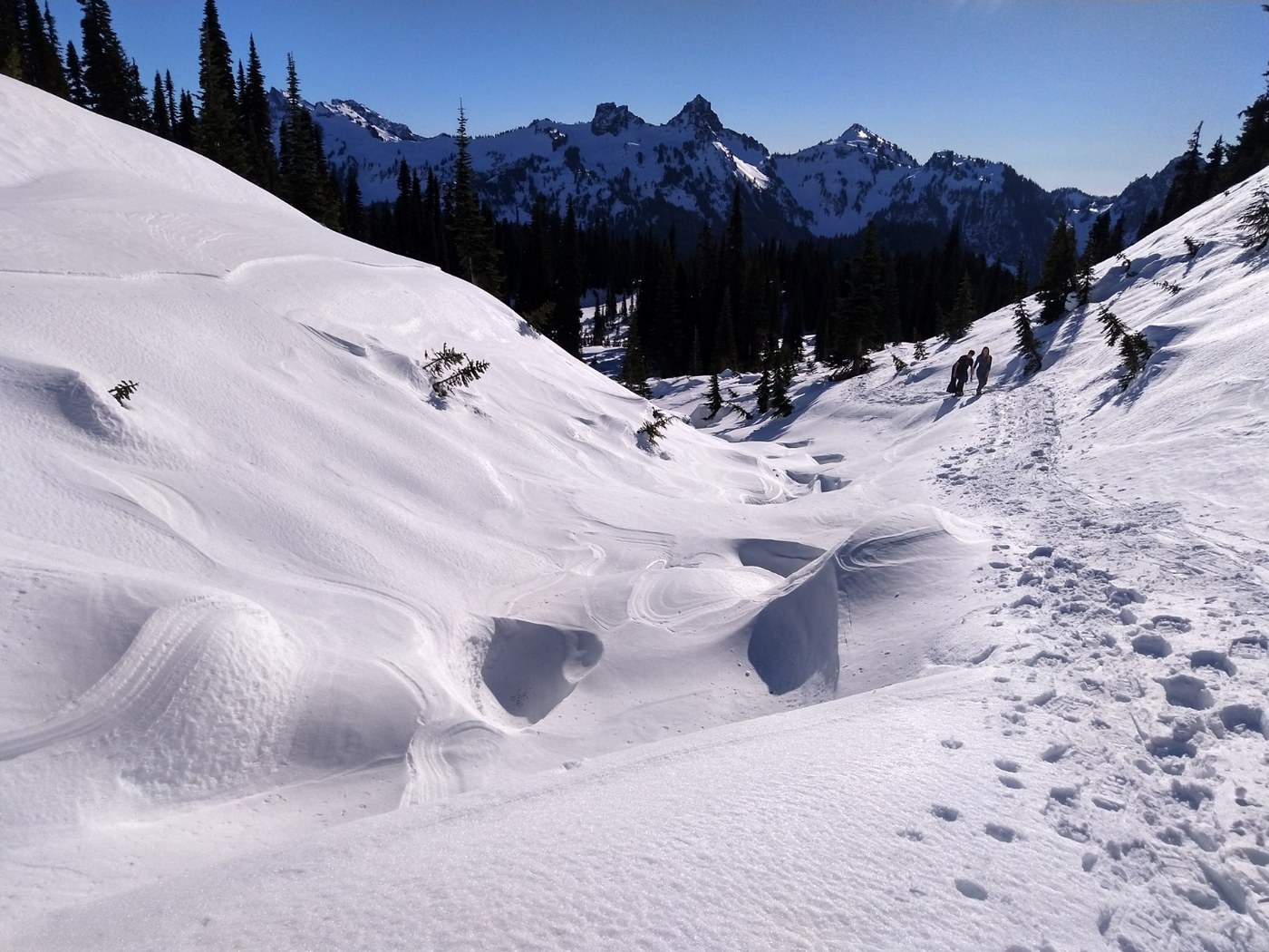 The Nisqually Vista is a mellow lollipop loop through mostly treed terrain with the namesake vista at it's apex and a couple nice views of the mountain from the more meadowy portions. The snow here was better than anywhere else today and from the start of the loop portion there were no other people - it was a nice escape from the crowd at Paradise. Today there was a well defined track to follow. In fresher snow, look for bare metal blazes on some of the trees - they are subtle to spot sometimes but there seem to be some throughout the loop.