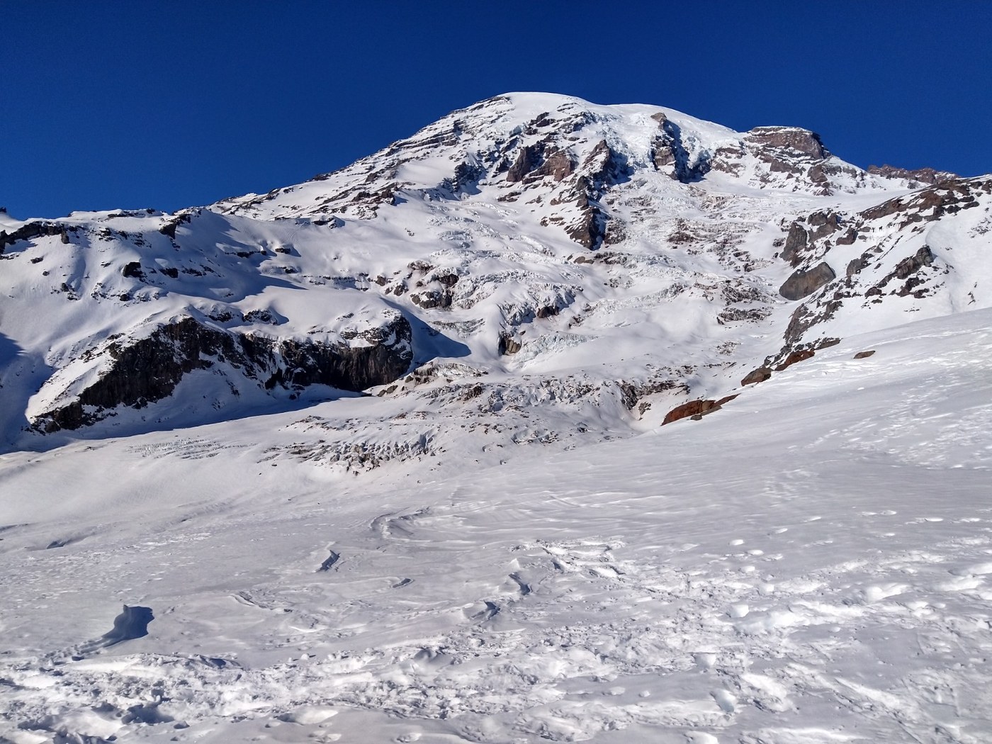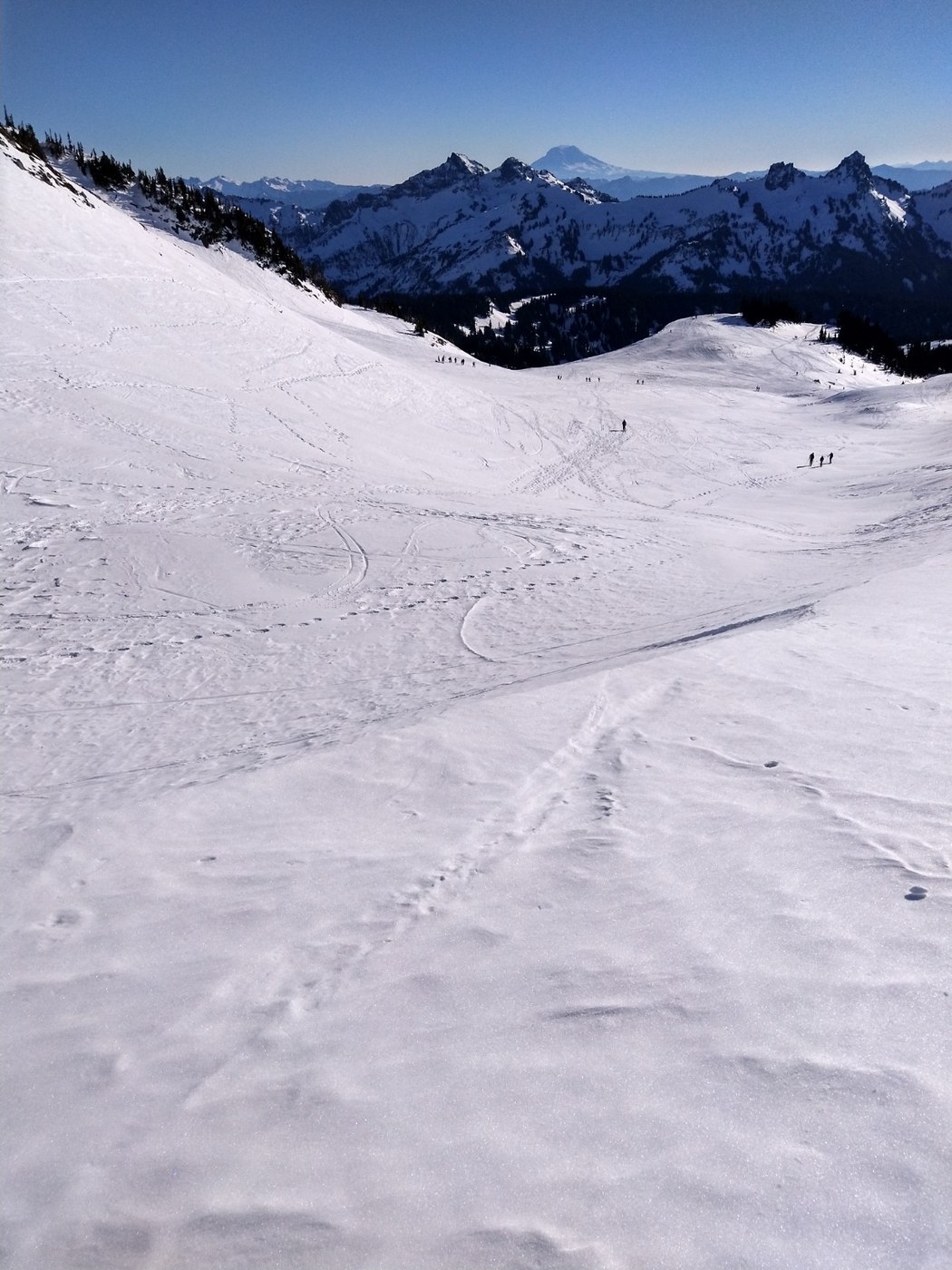 The Deadhorse Creek Trail all the way up to Glacier Vista was alternating sections of crust and corn snow. There were a handful of people on the lower portion of the trail and then once nearing the Skyline junction it was non-stop crowd the rest of the way up. I don't think I was ever more than 50 feet from another party. The "trail" here is a free-for-all at this time of year, so there were at least 4 well-trodden boot tracks between the Skyline and Deadhorse trails and a bunch of crossovers between them.