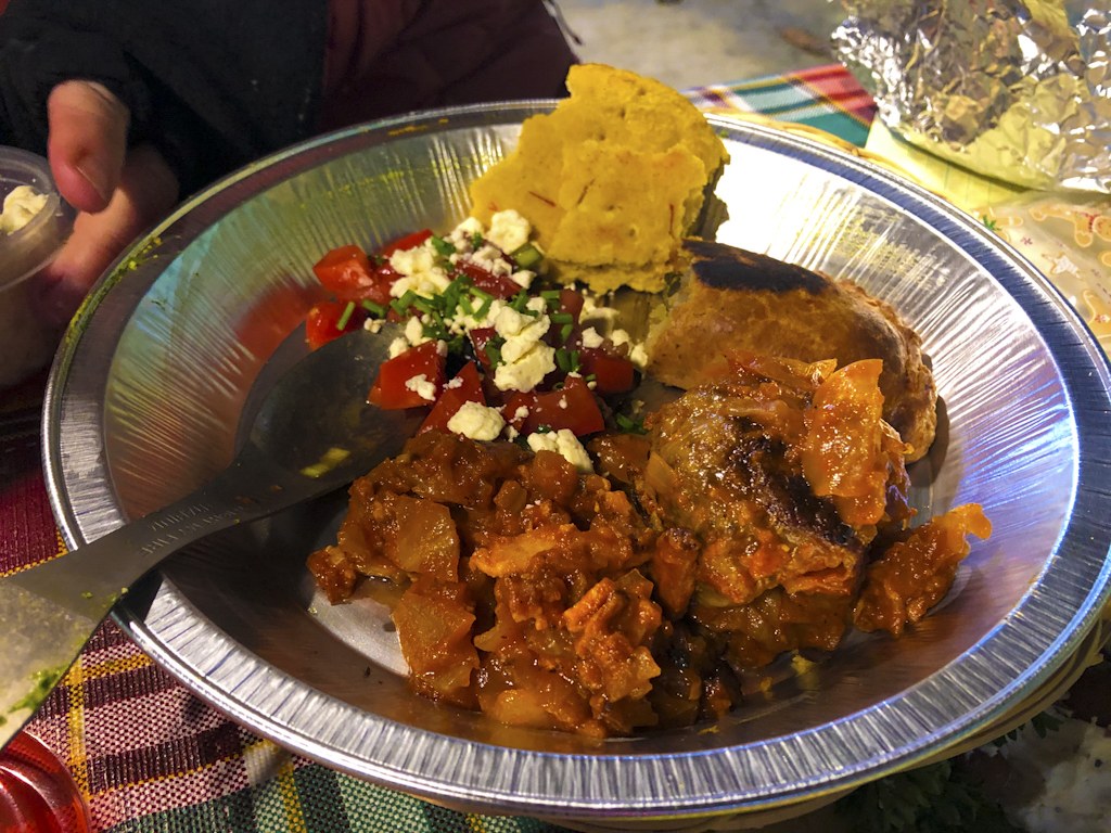 Dinner! ..my dear friend Linda is a World Vision Child Sponsor like me, so this year we decided to celebrate those 5 sponsorships with a dish from each of the 5 countries, using my single burner stove and backpack skillet: