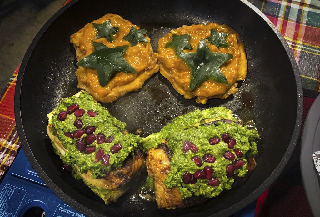 And for some Pacific Northwest cuisine we had halibut stuffed & topped with a green cilantro pesto with added pomegranate seeds for color!