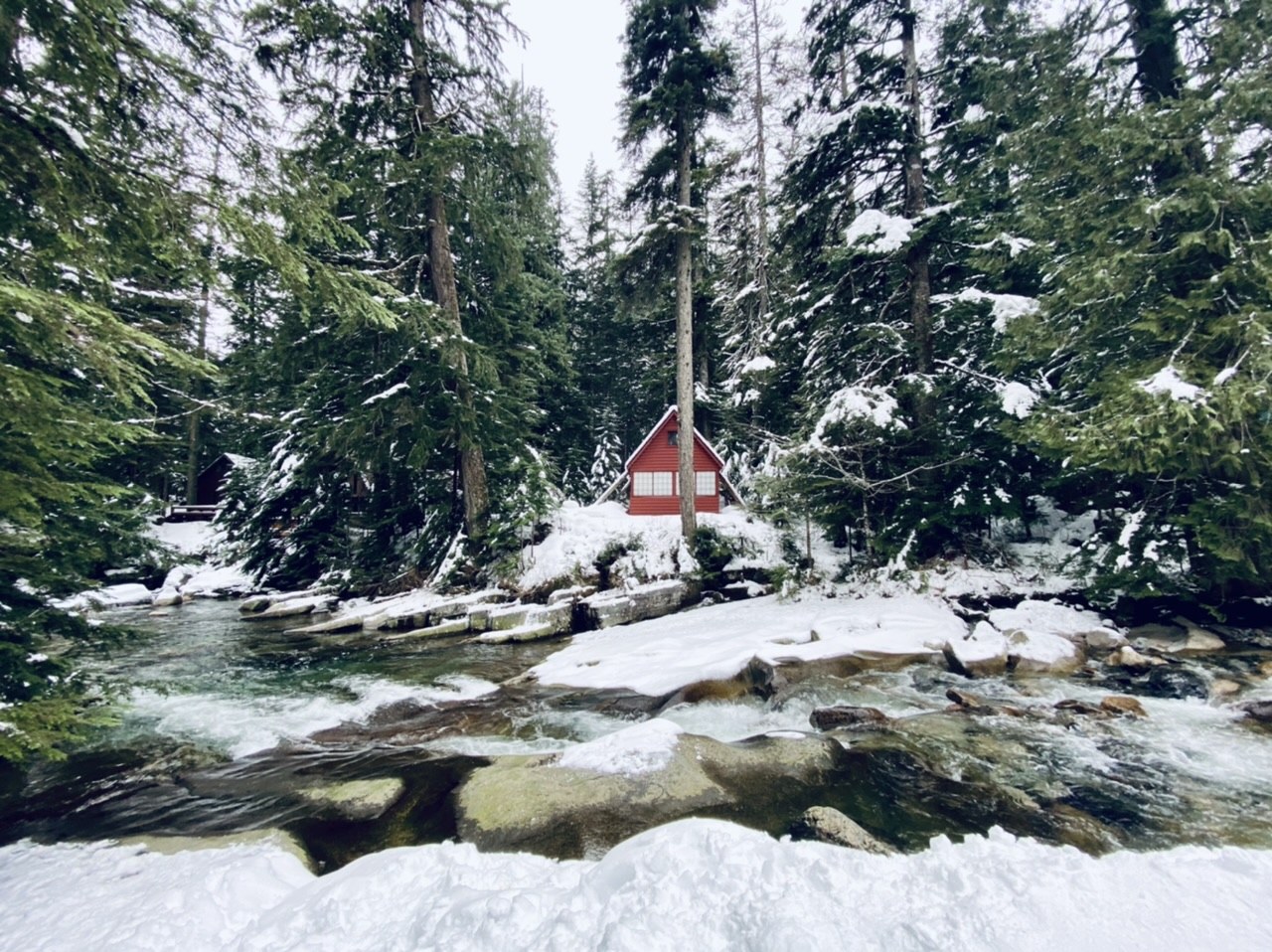 The forest road up to the trailhead is wide enough to safely distance but gets narrower once you reach Denny Creek Campground. We decided to do a loop and take the route that runs along the river to get to the falls. It was absolutely beautiful! The river and cabins along the trail are so picturesque in the snow. To get to this trail take a sharp left when you reach the fork at the end of the forest road. You’ll see a bridge ahead of you and the trail is to the right before the bridge. If you cross the bridge, you’ve gone too far. Again, the trail is super slippery and covered in ice so without spikes you’ll be miserable and potentially injure yourself.