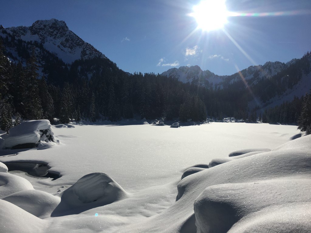 The terrain leveled out about a quarter mile from the lake and I arrived at 4.6 miles and 4490ft about 1:20pm just counterclockwise from the outlet. There were some old tracks in the snow but not a soul in sight. I enjoyed the sun, solitude and views on this blue bird, windless day. The only distraction was the occasion jet or two or three from Whidbey that like to do flyovers here.