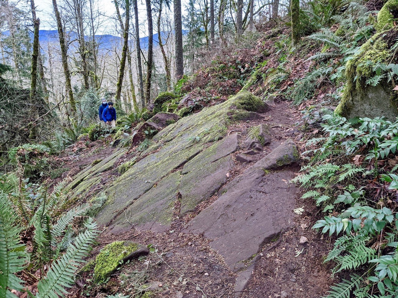 The trail is in excellent condition, a little muddy in spots (as you would expect), but not bad, and generally free from debris. The muddiest spot we encountered was by Lake Desire, although someone helpfully put down a few pallets to enable people reach the log along the shore. Houses line the lake, but otherwise you will seldom see any sign of the surrounding neighborhood. We could also see some buildings in the valley below from atop Echo Peak, but that was it.