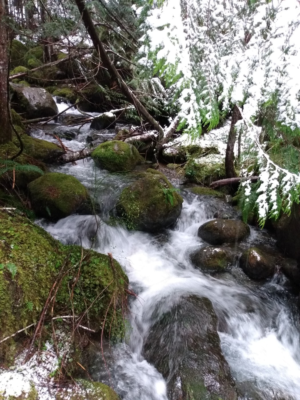 Arrived at 8:15, only one other car in the lot. Toilets at campground are locked, FYI. Rain turned into snow a short ways up the hike but wasn't sticking much except in a few areas, nothing hard to cross. Creeks were beautiful on this rainy/snowy/misty day. The trail was in great shape, only a few very small muddy areas. Thanks to all the volunteers that created this beautiful trail!