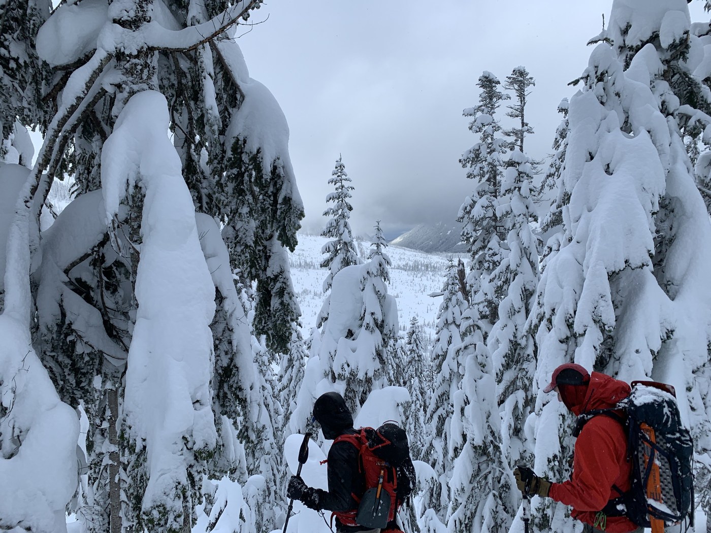 At the pass, I coincidentally met a couple of climbers about to ascend Mount Catherine and followed them up the west slope for a solid hour. Caltopo/Gaia topo maps show moderately sloped terrain up to a ridge that seems easy to traverse, but the avalanche forecast called for considerable avy conditions and we found it pretty quickly. With the deep new snow and the steep micro-terrain features, the top layer was borderline unstable/faulty and we called it a little above 4200' (for scale, Nordic Pass is at 4000' and it took an hour to climb 200' vertical feet. There is a lot of snow up there). It was the safer judgement call and I'm glad I was with people more experienced than me to make that call. The clouds parted on the way back down and we saw a soaring bald eagle and a nice view of the valley, so that's pretty neat. I said my good-byes back at the pass and made a bee line for Rockdale Lake and the Grand Junction Warming Hut before walking back down to Hyak Lake and Silver Fir lift.