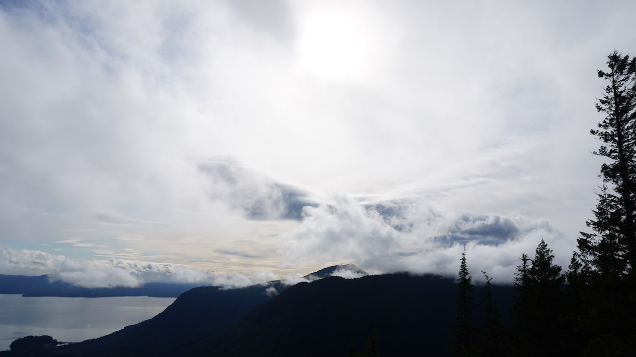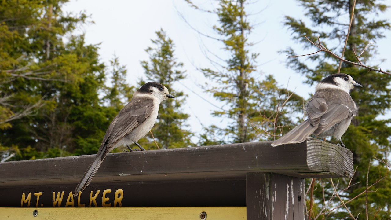 The trail is in great shape (only one downed tree we had to hop over) and is bare until about 1/2 mile from the top, where it becomes highly recommended to wear microspikes due to the icy/slippery slope. There is only about 2-3 inches of snow at the summit, so snowshoes were unnecessary today. There were not many views to be had through the fog and clouds, but the Gray Jays were out in force and kept us company while we had lunch at the east viewpoint. If you’ve ever wanted to pet some wild Birds, this is the place to do it. They are brave enough to come and land on your sandwich that you’re holding in your hand, but they aren’t quite smart enough to dodge snowballs (softly thrown, of course). Be sure to check out the Chimacum Cafe for a post hike slice of Pie (many varieties) if you’re headed back in the direction of the Hood Canal Bridge.
