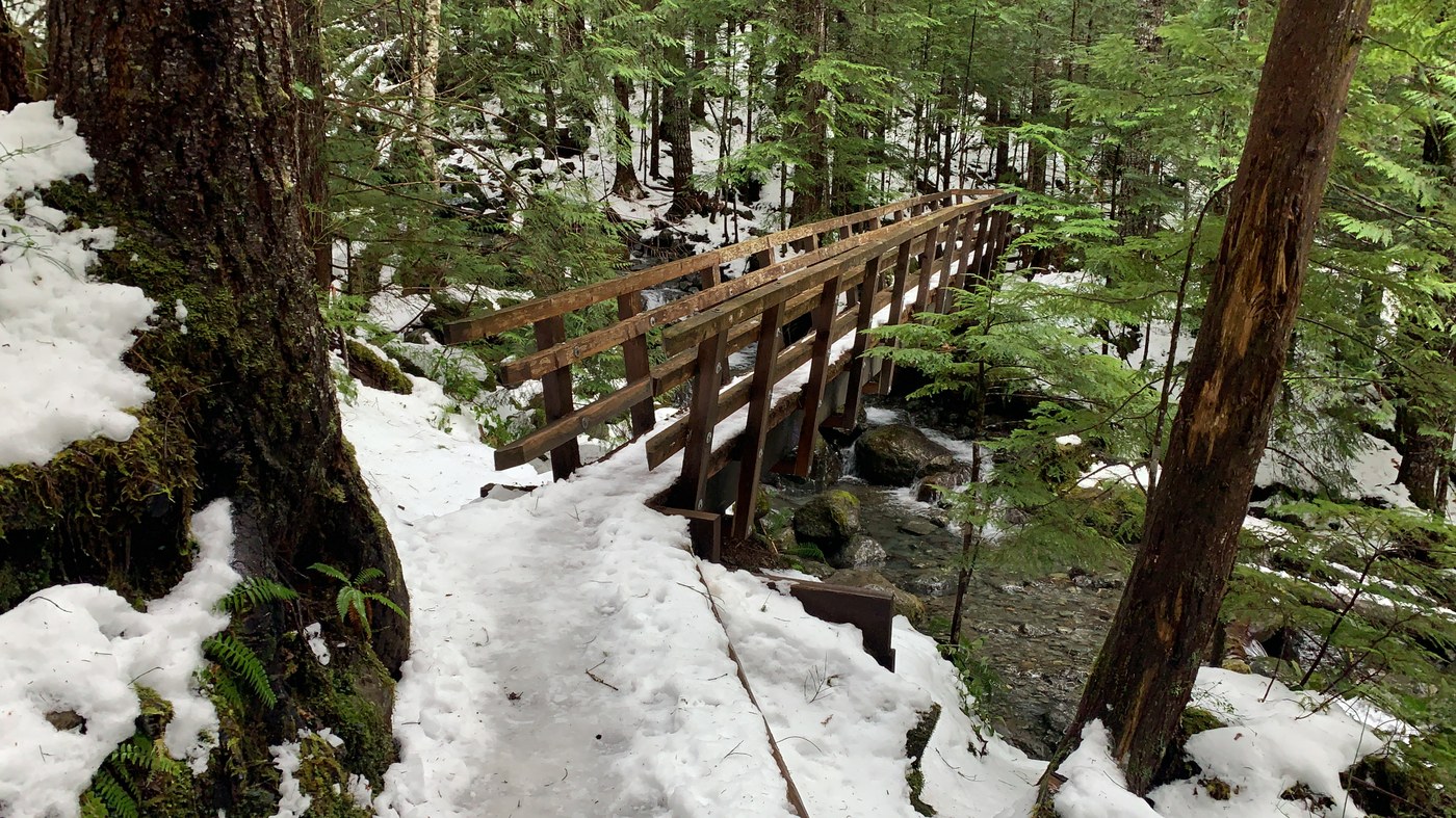 Some snow along side the trail early on, with full compact icy snow cover about a mile and half up and surrounding the bridges. Used microspikes for better grip. Could be possible without with careful step.
