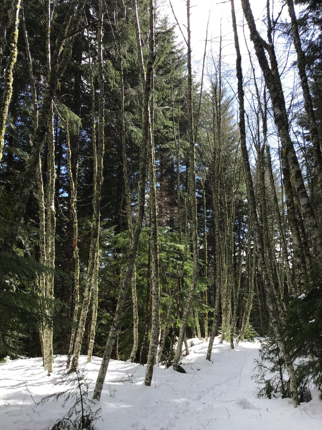 I arrived at the trail head just before 11 on a potentially sunny Saturday morning. Going clockwise I hit easy to traverse snow near the top of the massive incline. Since I could finally see blue skies above I put on the microspikes and headed up to the lookout via the Ellinor connector. You can make it up to the lookout without the spikes with a little slip and sliding and some caution (a few hikers proved this). I wouldn't recommend tennies and no spikes for the trek back down. But you do you and rock the trail how you see fit. There isn't enough snow to merit worry, just enough to dazzle you with snowscapes here and there. The lookout rocked the planet. Totally worth it.
