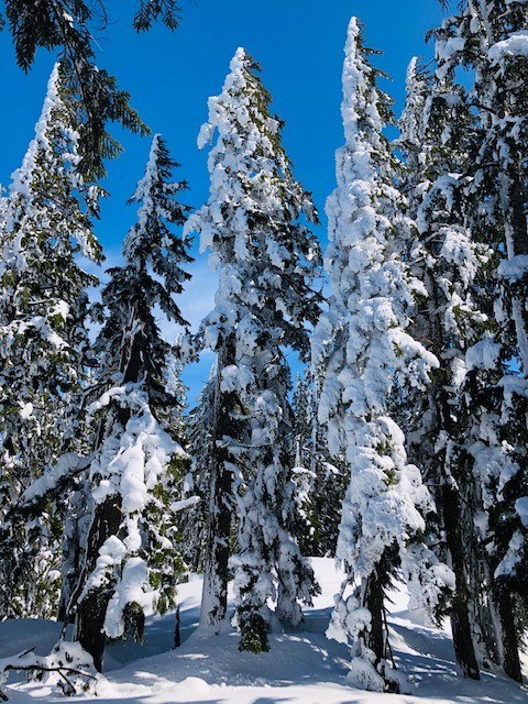 Route: My route to Mount Catherine always starts from Annette Lake TH. I especially like it because I can do a loop instead of a monotonous in-and-out. In snow season, I go off trail right after the switchback section and just climb due east. Interestingly there were 2 ski groups who planned to ski down from the bowl under Silver Peak. They opted to go off, with their skis on, before the switchback. I am curious if they were successful or not because I did not see them when I stepped on Olallie Meadow XC area. I did not follow the summer trail to Catherine which is actually a much steeper climb in deep snow condition. The GPS map clearly shows that a direct climb off the XC road to gain the ridge is not only shorter but less inclined. Still it was a touch climb with snowshoes. I wished I had two ice axes with me. On the ridge there was a different problem, the raining "snow bombs". Often times I had to stop and looked up first, then walked gingerly in a center line between trees.