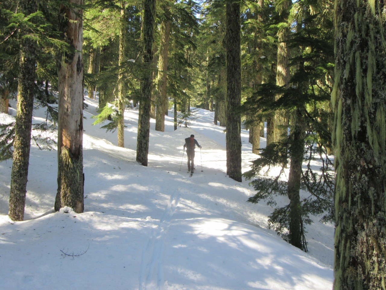 Our old guidebook (Cross-County Ski Tours: Washington's South Cascades and Olympics by Kirkendall and Spring) describes this trip as an option to the Mount Catherine Loop, but because the maps in that book are so difficult to read, we had never before figured out how to get to Nordic Pass. Thanks to better maps and a GPS we finally sorted out a viable route. We used Nordic backcountry skis for the trip.