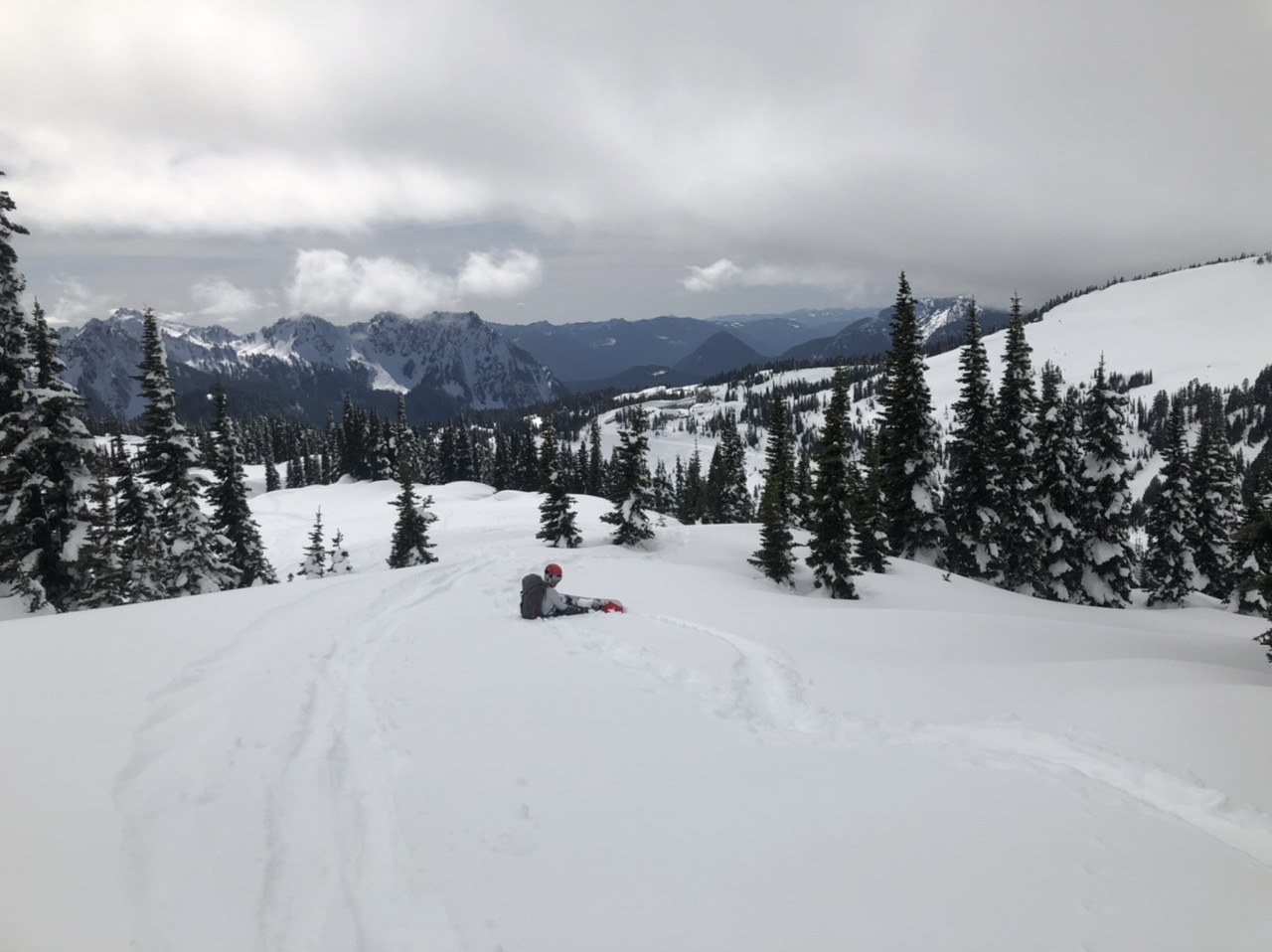 We did a loop ski tour of Glacier Vista, kind of skirted around Panorama Point, went toward McClure Rock and took a break before descending near the Van Trump monument and came out via Edith Creek. We idea was to avoid crowds. Mission accomplished!