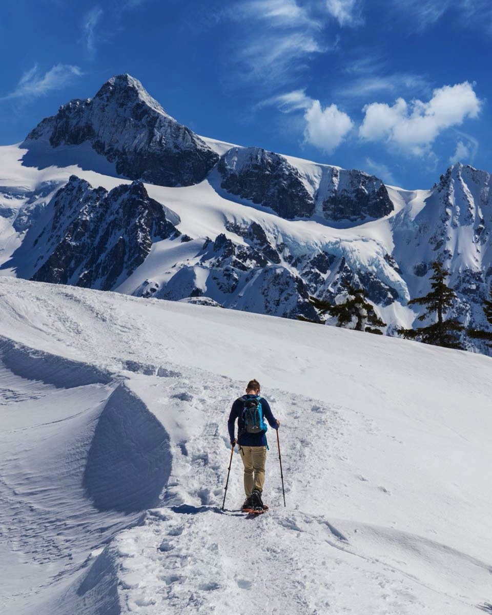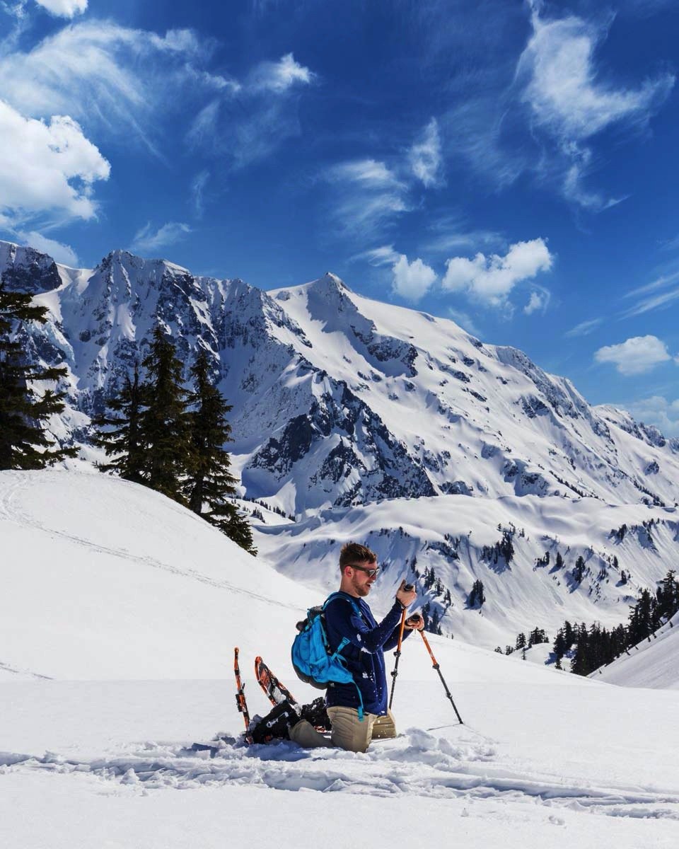 The road up to the trailhead was completely clear. You want to park at Austin Pass. The trail is right next to the bathrooms up. We went back and forth on if we needed snowshoes or if we could get by with spikes. I would highly recommend snowshoes. Even though you could get away with it, the snow in some parts were really soft already, and I’m sure it’s only gotten softer. Follow the footprints up to the top to artist point, since the trail itself isn’t really defined. I would also recommend having a map just to be safe, but at all times you could see the parking lot just about.