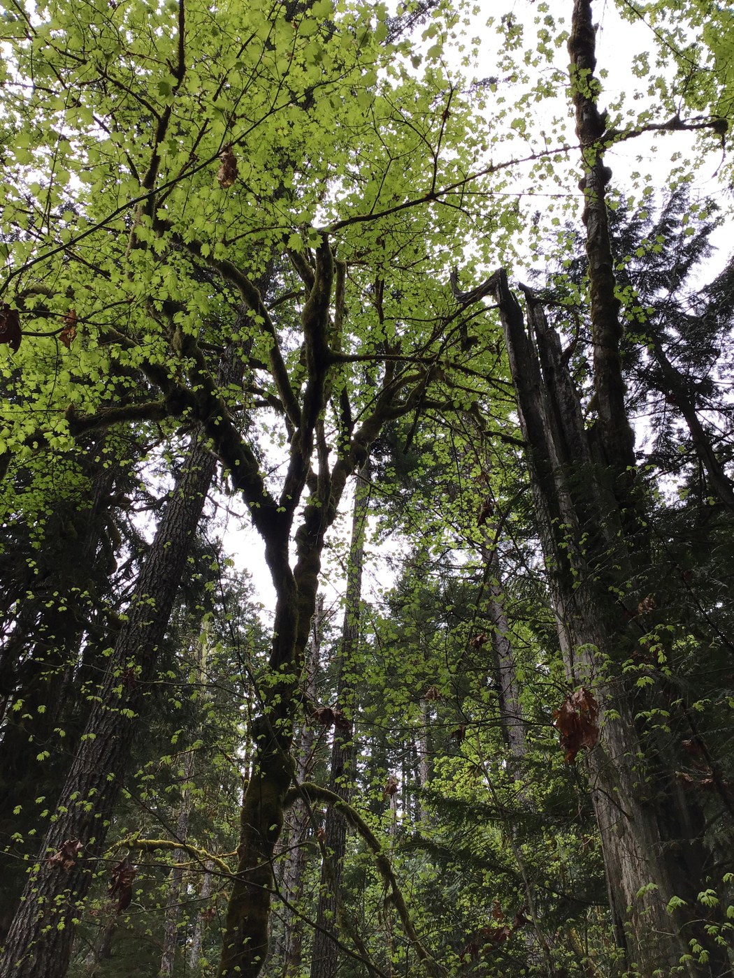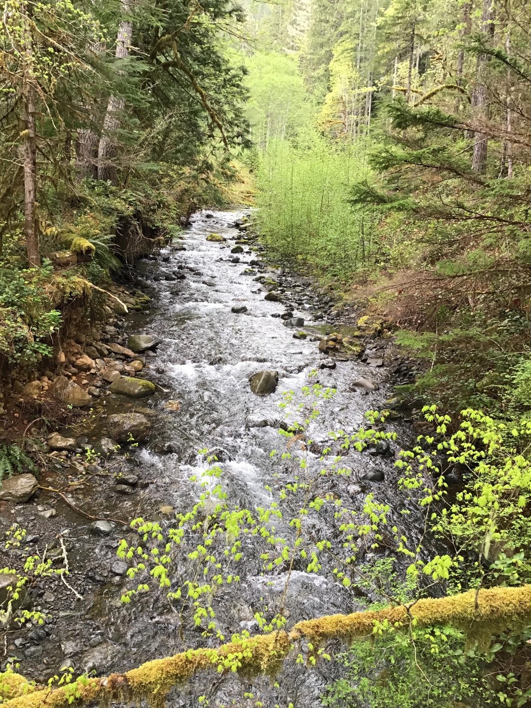 It's all new spring green right now. I arrived at the trail head at 10 a.m. on a partly cloudy Saturday. It was easy parking on the side of the road, light hiker traffic all the way to the lookout point and back to my car, snow-free, and absolutely beautiful. The bees are active along with the mosquitoes; nothing too annoying yet. Besides the bright green everywhere you look and the rushing water, wild flowers dot the sides of the loop trail. So far you can find pacific trillium, salmon berry, yellow evergreen violets, bleeding hearts, and spring beauties. I wasn't sure if the lookout on a cloudy day would be worth it. It was worth it times ten. Happy hiking.