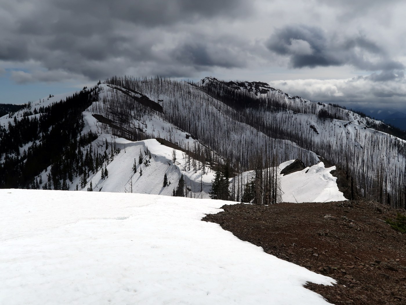 The gate is open, and despite potholes past Indian Camp, most cars should be able to reach the start of the multi-use Yellow Hill road/trail. Blowdown will discourage ATV use until it is cleared. Snow patches started showing up around 4000' and soon became continuous, but made for easy booting straight up Yellow Hill. I was mostly on snow for the rest of the ridge, but never needed snowshoes.