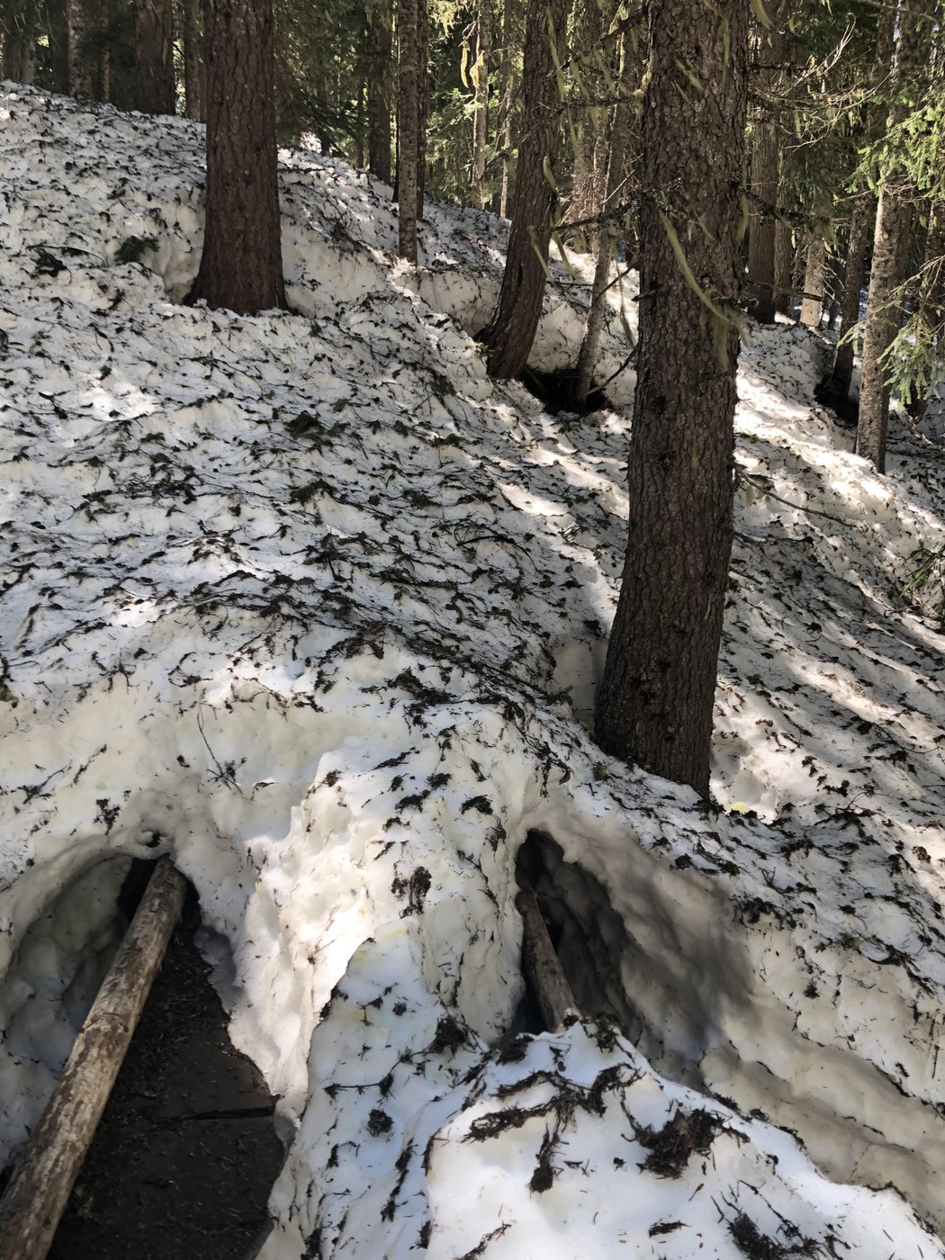Tried to hike in to Jolly Mtn via the Salmon La Sac trailhead. Followed the excellent directions from the WTA website. Parked in the “day use only” parking immediately North of the Cayuse Horse Camp and walked in through the horse camp. Followed the road that goes past the campground host campsite ( RV parked there) and followed the road up to the clearly marked trailhead sign. It’s a multiuse trail, that includes motorcycles. The trail is covered with large loose rocks, with a rut in places, due to motorcycle tires, very doable, but quite rough. Some early blooming wildflowers on the way in. About 2 3/4 miles in I ran into snow which soon became continuous, and up to three feet deep. Ended up using GPS to stay on the trail. The bridge over Salmon La Sac creek was covered with snow at one end. The snow covered slopes on the other side of the bridge were steeper then I felt comfortable doing without an ice axe and crampons/microspikes so I bailed:( coming bak in a few weeks.