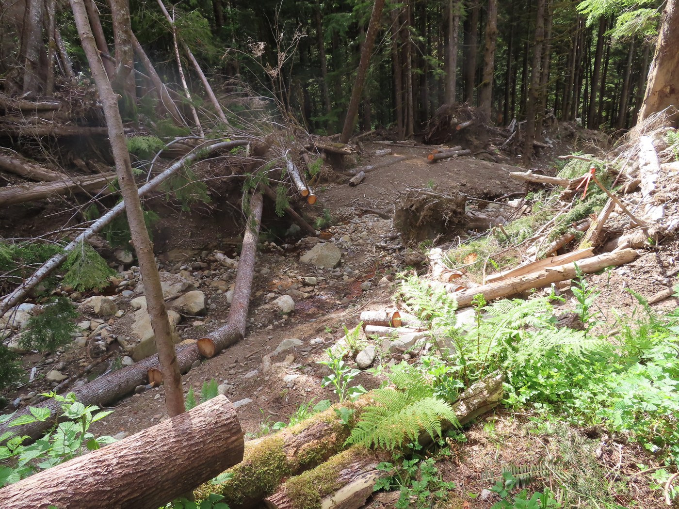 Began my hike up the Bessemer Road off the Middle Fork Road by the DNR blue gate to see some waterfalls. Parked at the small lot for the Oxbow Loop Trail and walked the paved road to get to the gravel road. A short way up the road I crossed West Fork of Blowout Creek on a metal road bridge where some of the wood planks have rotted away. When I got up to the junction with the CCC Road Trail I checked the one log bridge over the roaring WF Blowout Creek. It is about a foot wide with no hand rail. I turned right and continued up the road where this section is also part of the CCC Road Trail. On the left side of the road, I saw a side trail heading up through the forest. I soon came to the first replacement CMP (a 4 foot culvert metal pipe). Part of this road had been washed out, covered in mud and had many fallen conifer trees on it from a heavy rainstorm about a year and a half ago. At the first switchback of the Bessemer Road is where the CCC Trail continues NW past Tall Moss Cliff. A new trail had been built to get through the blown out creek area. Several fallen trees had to be cut out. I continued hiking up the road where I could see the damage from the creek blowout. Further up another new large culvert had been installed. I then saw the upper part of the trail I had spotted down below meeting with the Bessemer Road. I found out it had been built when the road was washed out.