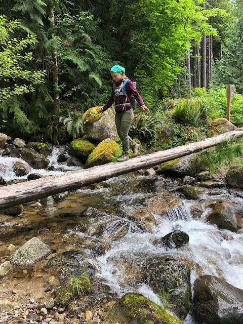 We suggest parking in the Oxbow Loop parking lot just past the blue gate. It had a super clean privy and is just a short .2 mile backtrack walk along the road to the blue gated trailhead. We crossed the always sketchy log bridge at the beginning of the turnoff and over Blowout Creek easily this time and also the many other stream crossings along the way though caution is always advised as some of the rocks are tippy and slimy slippery.