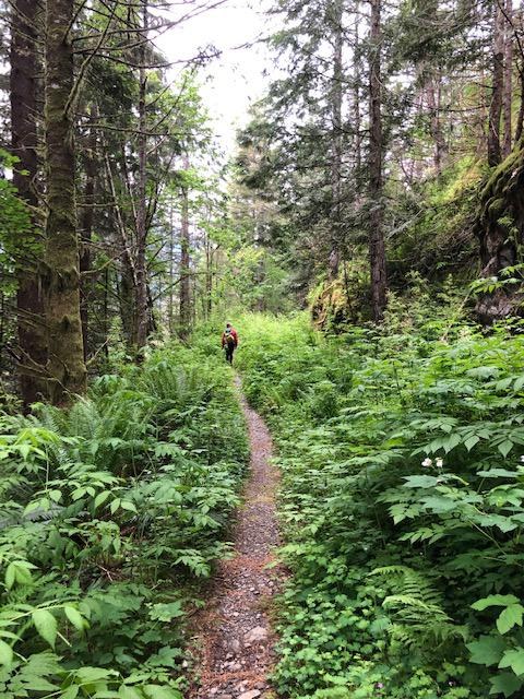 We did see: a frog, a nest of two birds (one had a red head, sadly we couldn't get any pictures. Can anyone identify it?), black bear scat, wild flowers, and lots of variety of plants such as Coltsfoot, Thimble berry, Salmon berry, nettles, devils club, tons of ferns, salal and lots more. We might recommend wearing long hiking pants as some of the trail is brushy. We got lightly rained on as well but the brief showers were mixed with pleasant and warming sunshine.