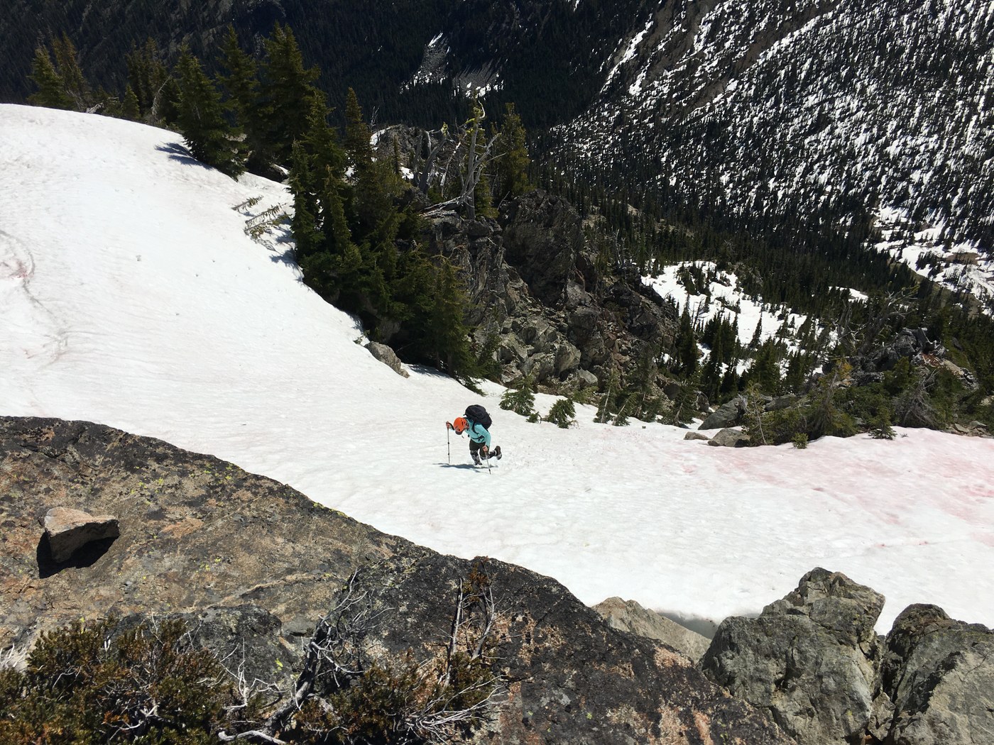 Once we got up to about 6200 ft we ran into a lot of snow. Ngie went straight up a steep col in the snow to get to the summit and I went more to the right getting on some rock to scramble and finding more of a gentle snow slope to the summit coming in from the NE. We took this way on the way down and even were able to boot ski all the way down to 6000 ft. Beware of changing snow conditions with the snow melt. I post holed once up to my waist!