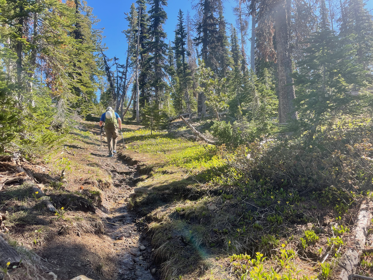 There isn't really a trail at all: one just needs to be careful and find low impact paths. I was paying a lot of attention to my footing because there was a lot of potentially fragile vegetation to negotiate. However, a good strategy many have used on Peakbagger.com, is to stick to the trees on the SE arête by the Fourth Creek drainage, instead of climbing up the loose scree field in the S. This seemed really good LNT wise and comfort wise on the way down.