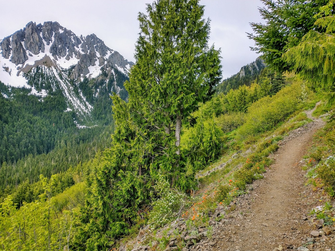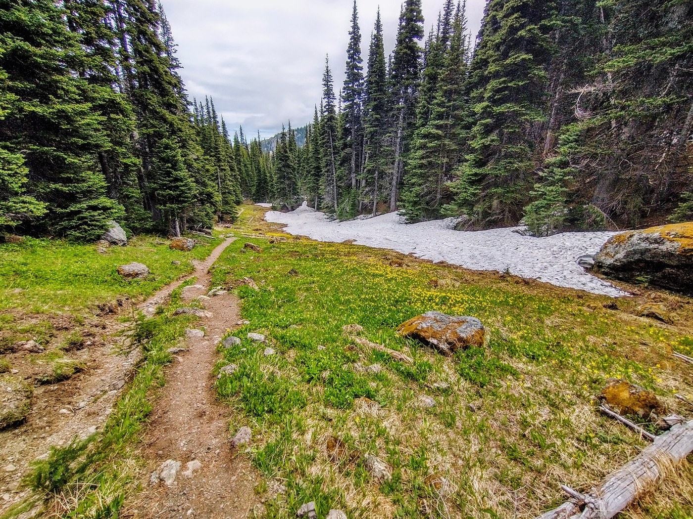 The trail out to the pass is in great shape. A few over-unders, no biggie. As you follow the Big Quilcene River up there are a plethora of water sources to filter right off the trail. Snowmelt is running right through Camp Mystery, anticipate a lot of mud if you plan to camp or hang out there. It seemed pretty busy, not many pads left. Some folks camped at the pass too. Between Camp Mystery and the pass, there are a few snowfields that could get sketchy early morning or later in the afternoon when slushy. On the way back I was happy to have brought my poles.