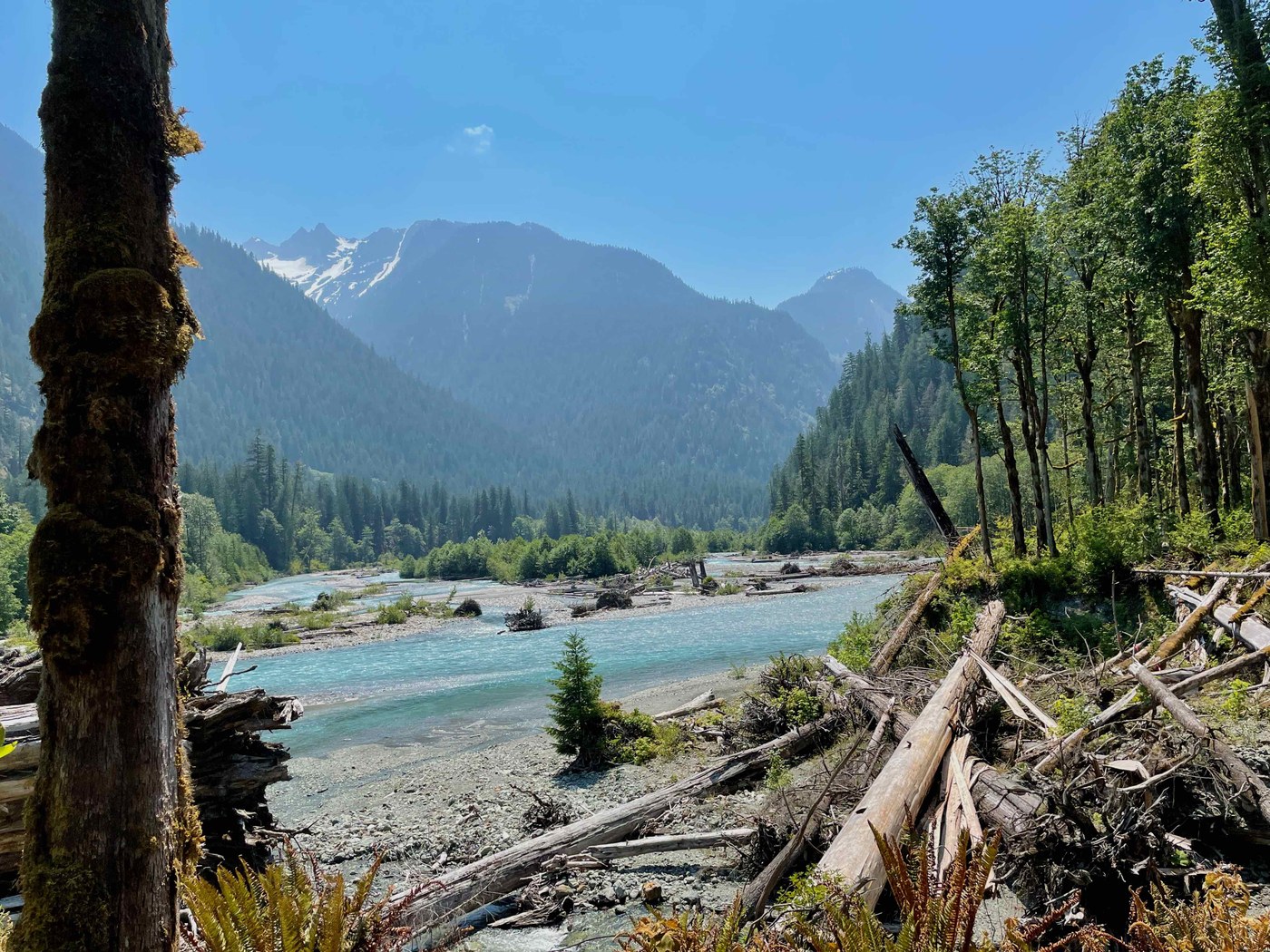 Returned to the suspension bridge and hiked up Baker River trail to Sulphide Creek for lunch. Water high there, too, but the air not as cool as at Hidden Creek because the terrain is more open. A few bugs, but most were not biting; trail also in great shape although nasty vegetation--devil's club and stinging nettles--beginning to encroach in places.