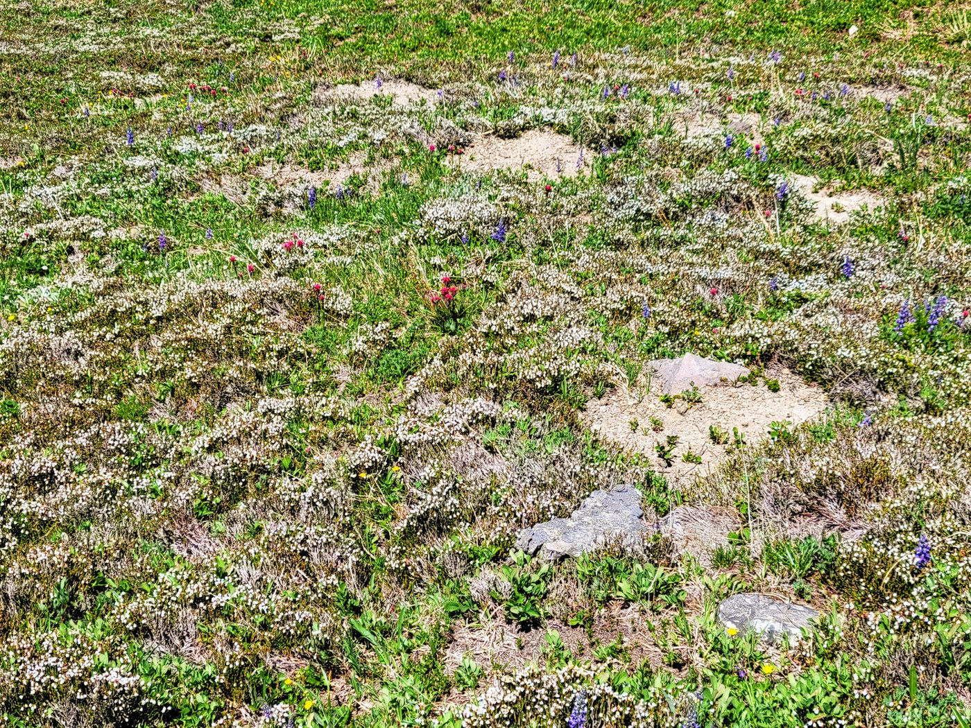A partial flower list: western anemone, Cusick's veronica, magenta paintbrush, low Jacob's ladder, sitka valerian, lupine, little-flower penstemon, American bistort, dwarf mountain lupine, glacier lily, avalanche lily, western springbeauties, spreading phlox, alpine aster, woolly everlasting, pink mountain heather, showy sedge, glacier fleabane, bog/alpine laurel, Jeffery's shooting stars, white marsh marigolds, fan-leaf cinquefoil, magenta/mountain paintbrush, cliff paintbrush, Tolmie's saxifrage, white mountain heather, Drummonds anemone, alpine buckwheat, tufted saxifrage, smelowskia, alpine golden daisy, partridge foot, Davidson's penstemon, tiger lilies, beargrass, Oregon anemone, yellow and purple violets, a light-purple rockcress, bluebells, and many others.