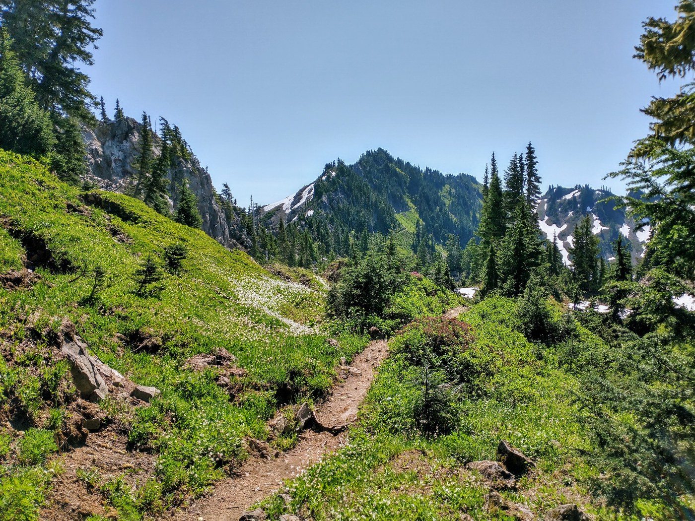 The trail up to Deer Lake is in great condition albeit very rocky(it's rocky the whole way really, your feet will remind you on the way down). This stretch has plenty of places to fill up on water and contains 3 camps(Canyon Creek) which all seemed like good spots whether you're just starting the loop or on the way out. Deer Lake was quite peaceful and ofc aptly named. Bugs really kicked in from this point on so come prepared with repellent. Just above Deer Lake, the trail navigates through various sub-alpine meadows until you eventually top out on the divide. From this point, there are few snowfields lingering where poles could be useful. Snow was slushy by mid-morning making step kicking easy.