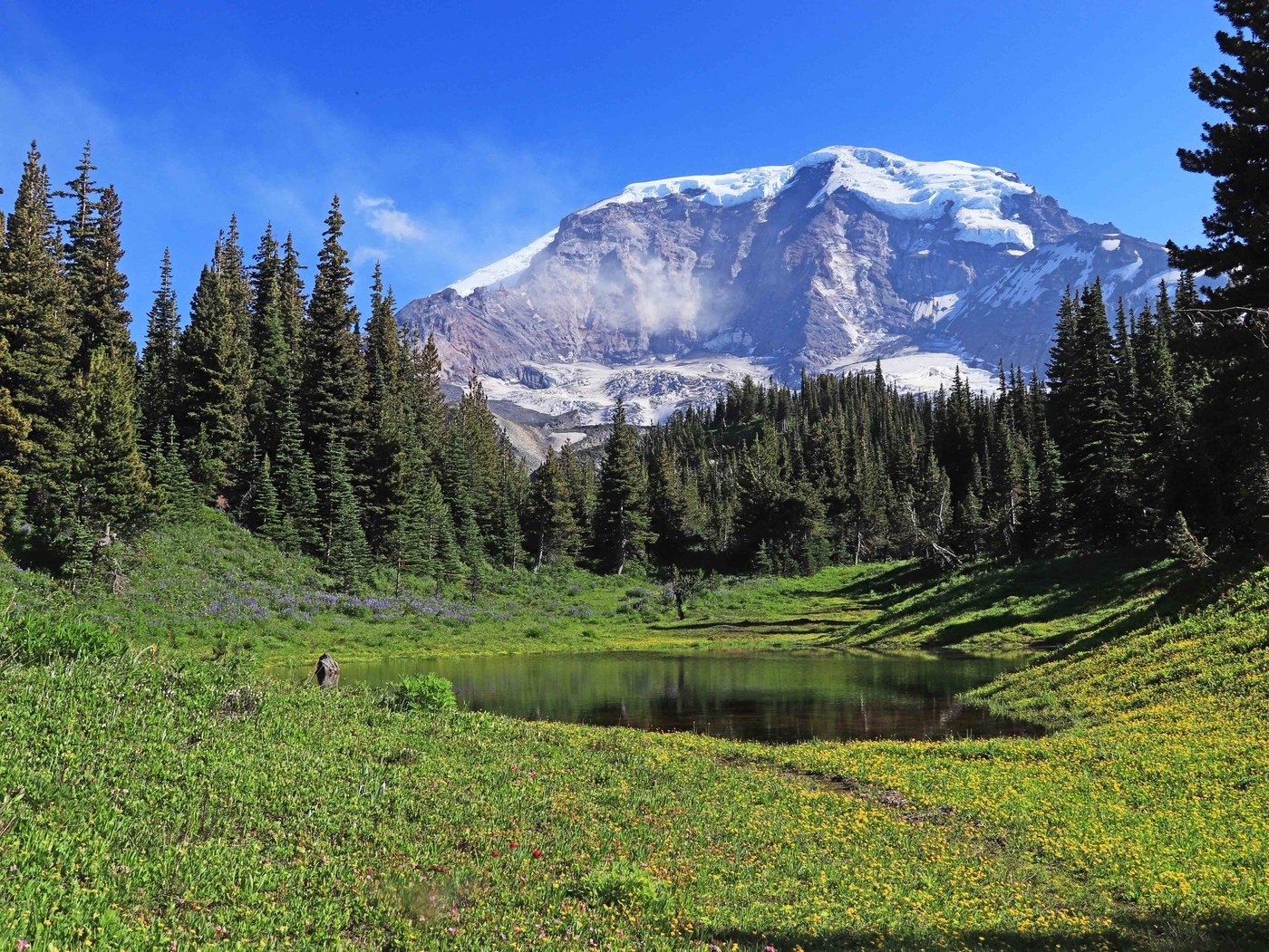 Plenty of mosquitoes at Mystic Lake upon my arrival. After a break at the lake proceeded up the trail to the pass and then veered off onto Curtis Ridge. There are several ponds (small lakes) up here with several meadows. Followed the boot path for 3/4 of a mile before wandering over to the west towards the Carbon Glacier. Instead of camping on the ridge overlooking the glacier, I selected a spot on the side of the meadow- good views of the mtn, adjacent to a small creek and loads of flowers were the drawing card.