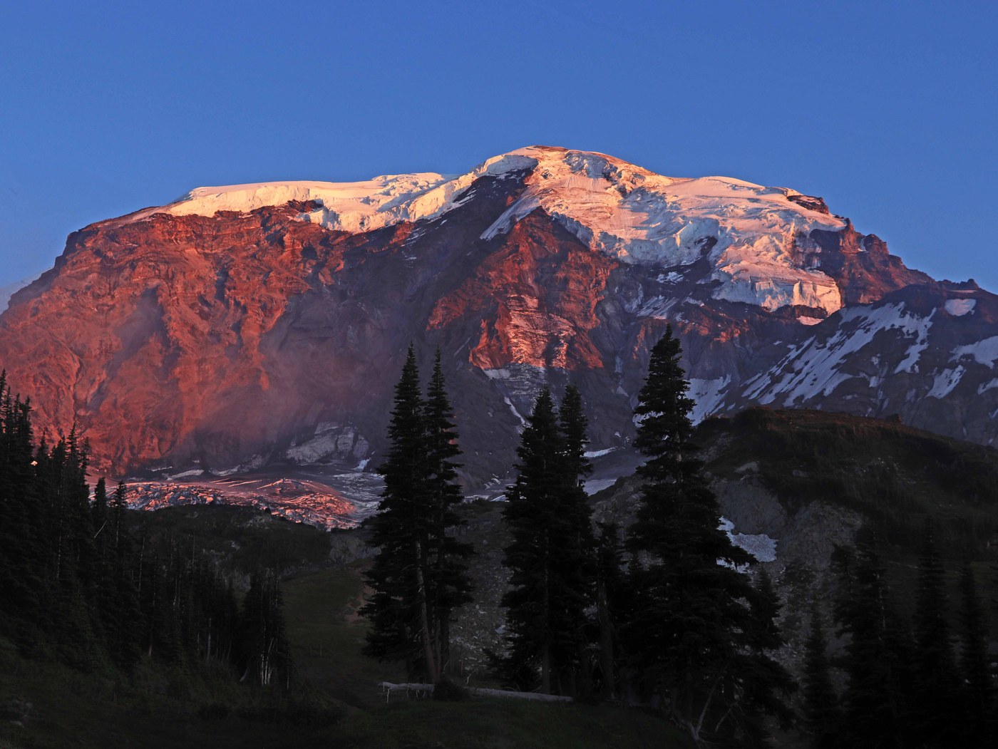 The little meadow I camped near had lots of pink mtn. heather in bloom- normally I don't get too excited about it, but some of it was a very rosy-pink tint that really contrasted with the dark green foliage. Was treated to fine sunsets both evenings and once again got up at night a took some photos of the mtn and Milky Way. The hike back to Sunrise on day four was uneventful. The snack bar at Sunrise is still closed, so if your looking for a cold drink after a hike- look elsewhere!