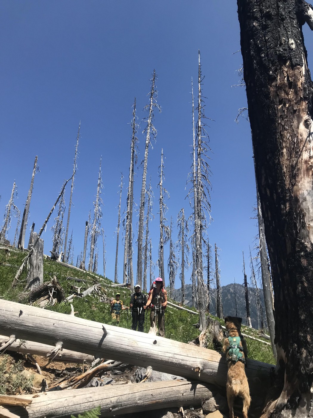 - Dogs: My 14.5lb pup tagged along on this trip and needed assistance only for the creek crossing (your dog does need to be in good shape and comfortable with handling blowdowns - she did a lot of maneuvering over/under). Do be cognizant of the heat - the burned section crosses through a few shady segments early on, but then travels several miles in full sun exposure. The trail is dusty to sandy, and may be very hot on paws later in the day. Most of the elevation gain to the lake is in this section as well. There's currently a few streams that cross the trail, and several are deep enough for a small-mid size dog to sit down in.