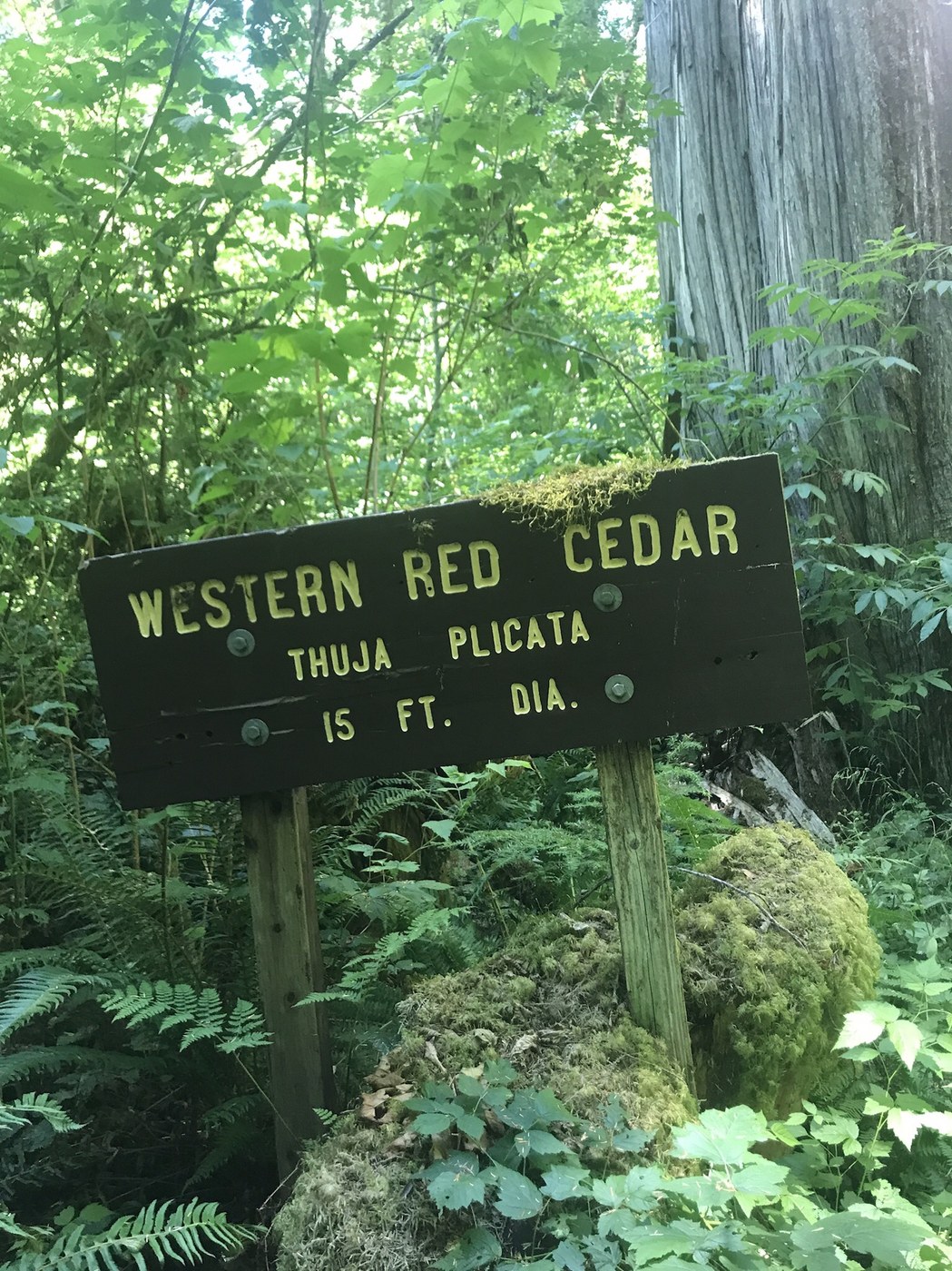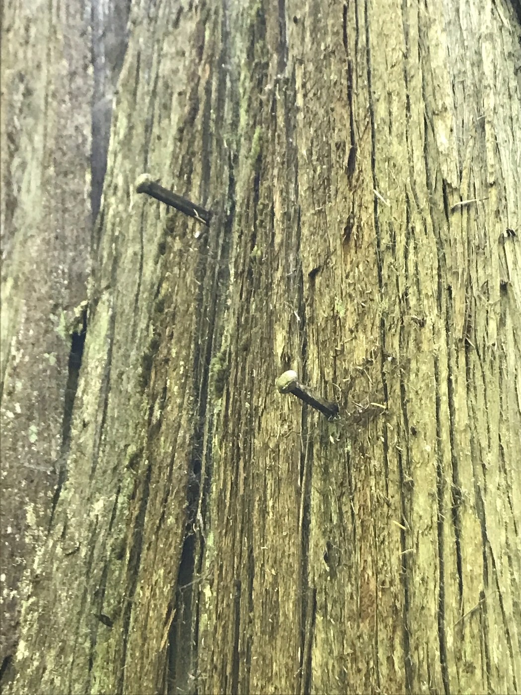 The trail descends about 150’ along an old logging road for .3 miles. Check out the spikes on the back of the larger diameter tree used to climb it. Amazing that these two old trees were spared the mill.