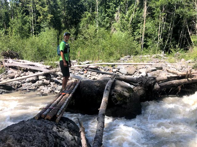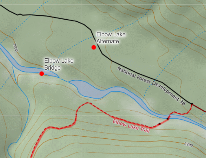 When we eventually made it back down to the Middle Fork, we realized the log in question was not as stable as we would've liked. Fortunately we took our time exploring and found a makeshift bridge downstream a ways. There is a faint trail on the south side of the river leading to the bridge off of the mapped Elbow Lakes. There is also a trail from the bridge up to the road. I marked both locations and you can see on the attached image.